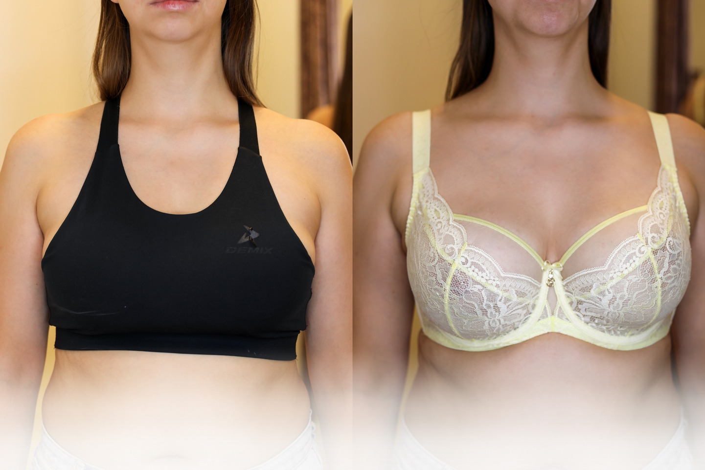 Наши консультанты предложили Анастасии разные варианты: бюстгальтеры базовые и более нарядные, с мягкой и с плотной чашкой. Именно эти три понравились девушке больше всего, а самое главное – ей понравилось свое новое отражение в зеркале! Ведь вся фигура стала выглядеть более подтянутой, а грудь приобрела красивую округлую форму.