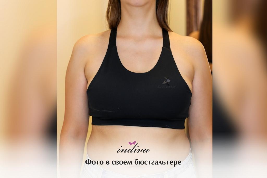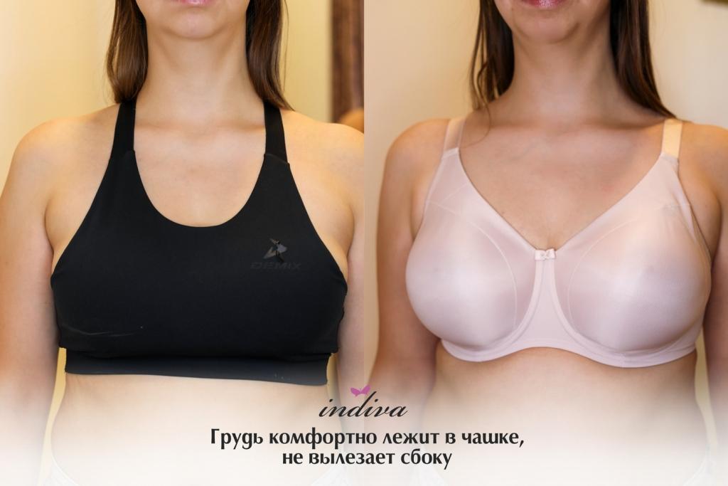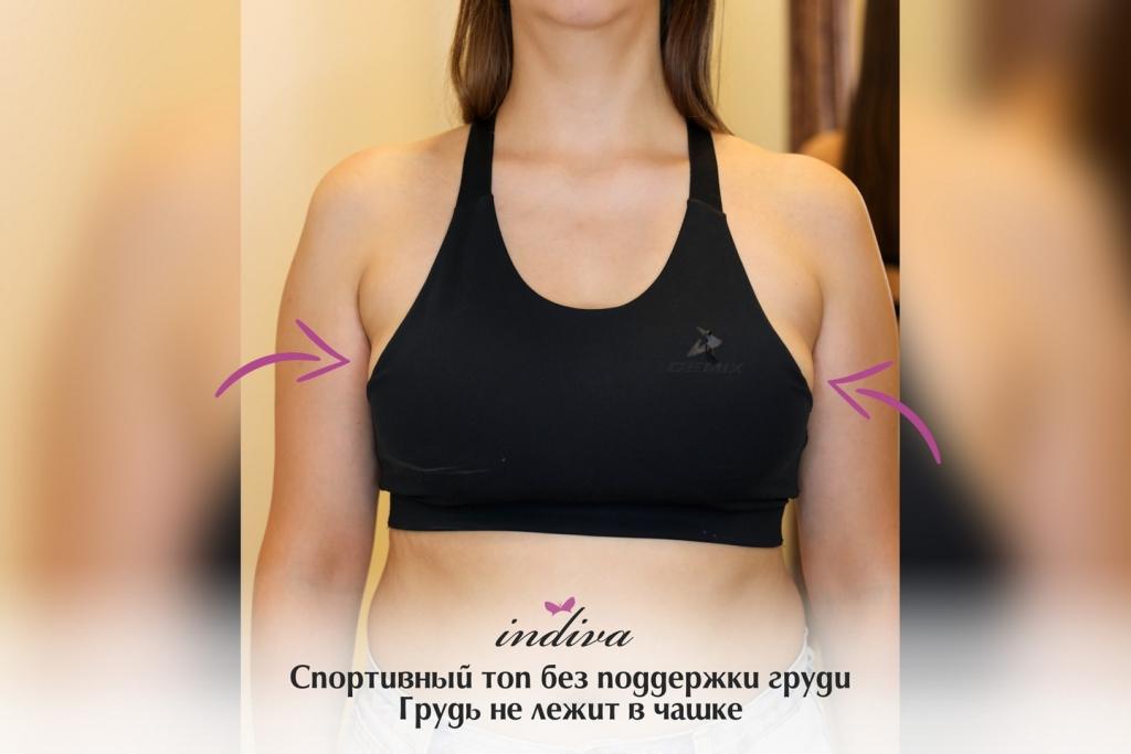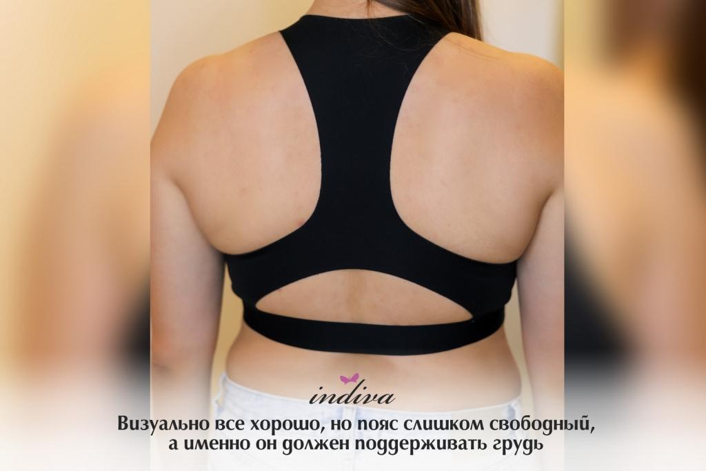 Выше фото Анастасии в ее белье. На первый взгляд кажется, что в целом все нормально и комфортно, но при детальном рассмотрении видно много недочетов. У девушки грудь средней полноты (75F), которой нужна поддержка. Ее спортивный топ не обеспечивает эту поддержку, грудь нависает вниз, а пояс подворачивается. Сбоку грудь также не зафиксирована и даже не помещается полностью в чашку.