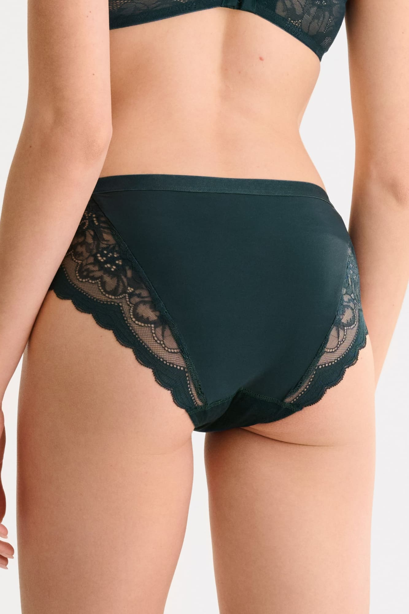 Красивые трусы слип выполнены из эластичного материала, микросетки и нежного кружева с цветочным мотивом.