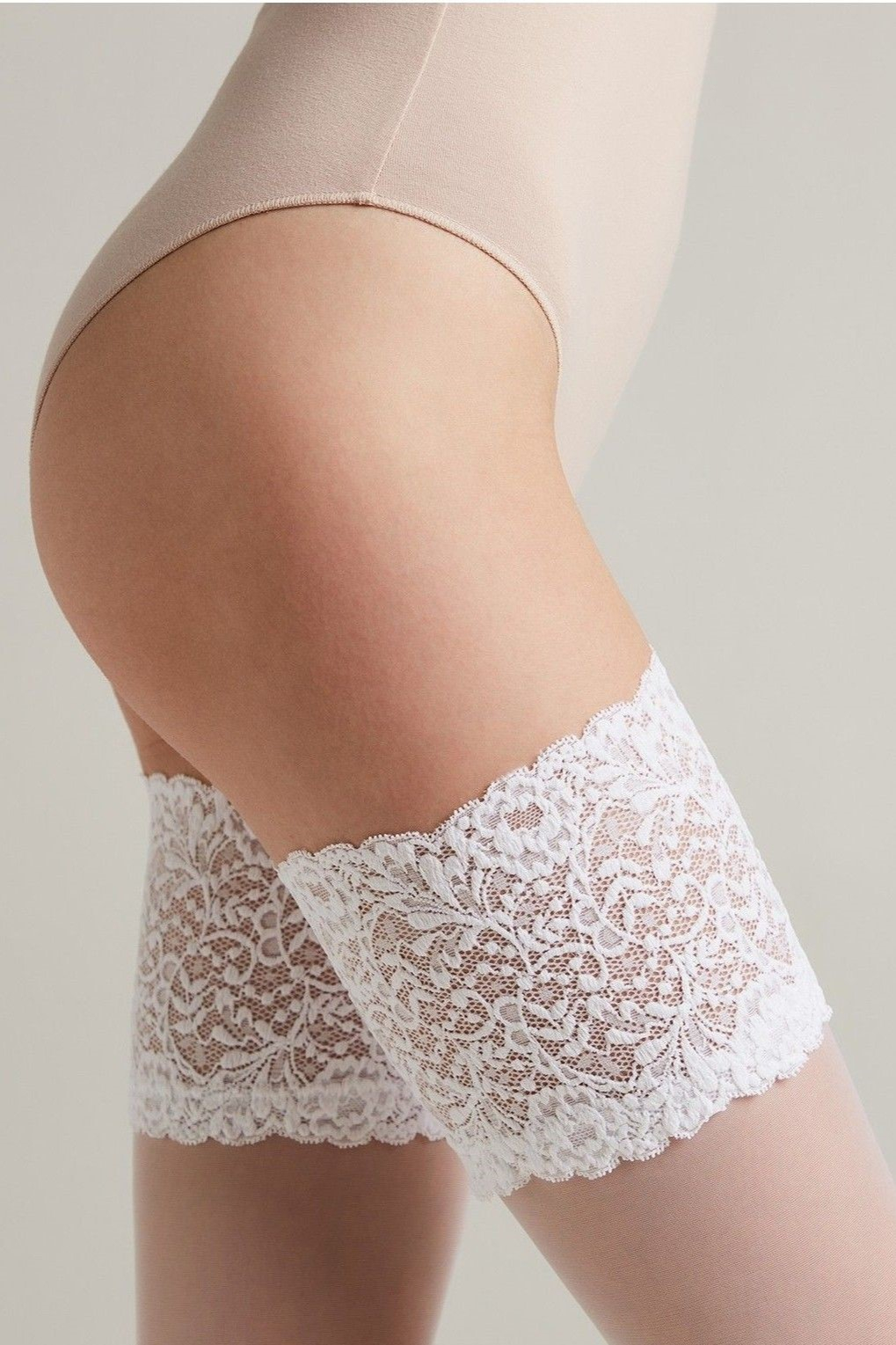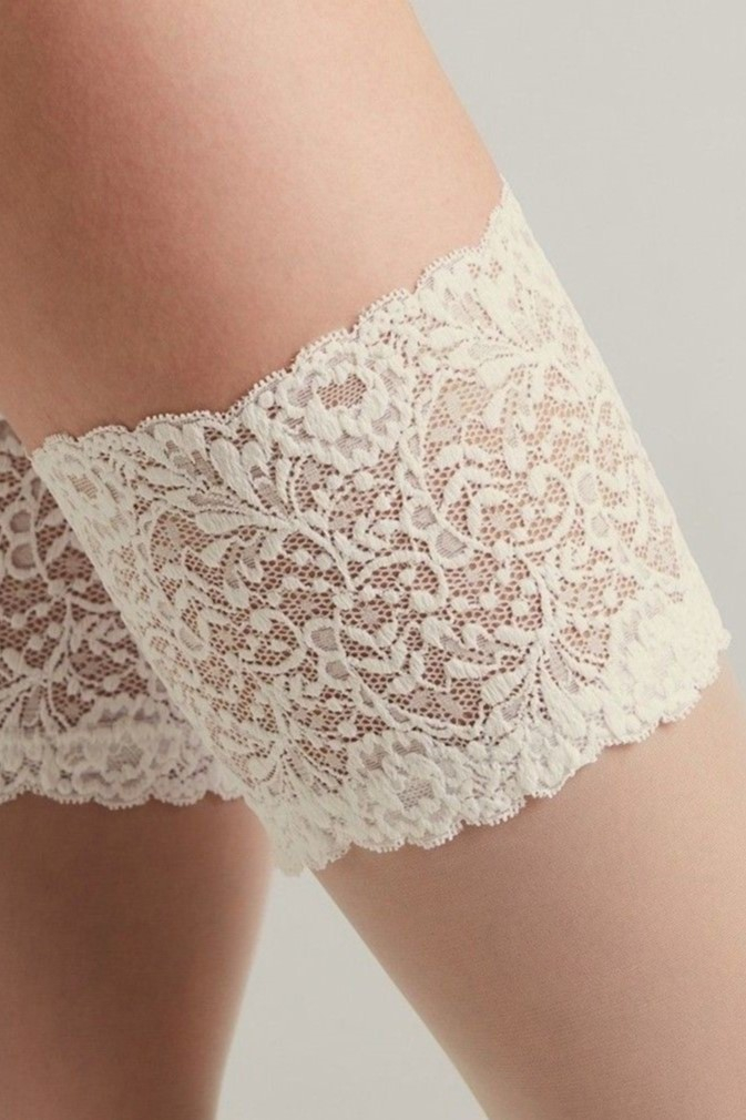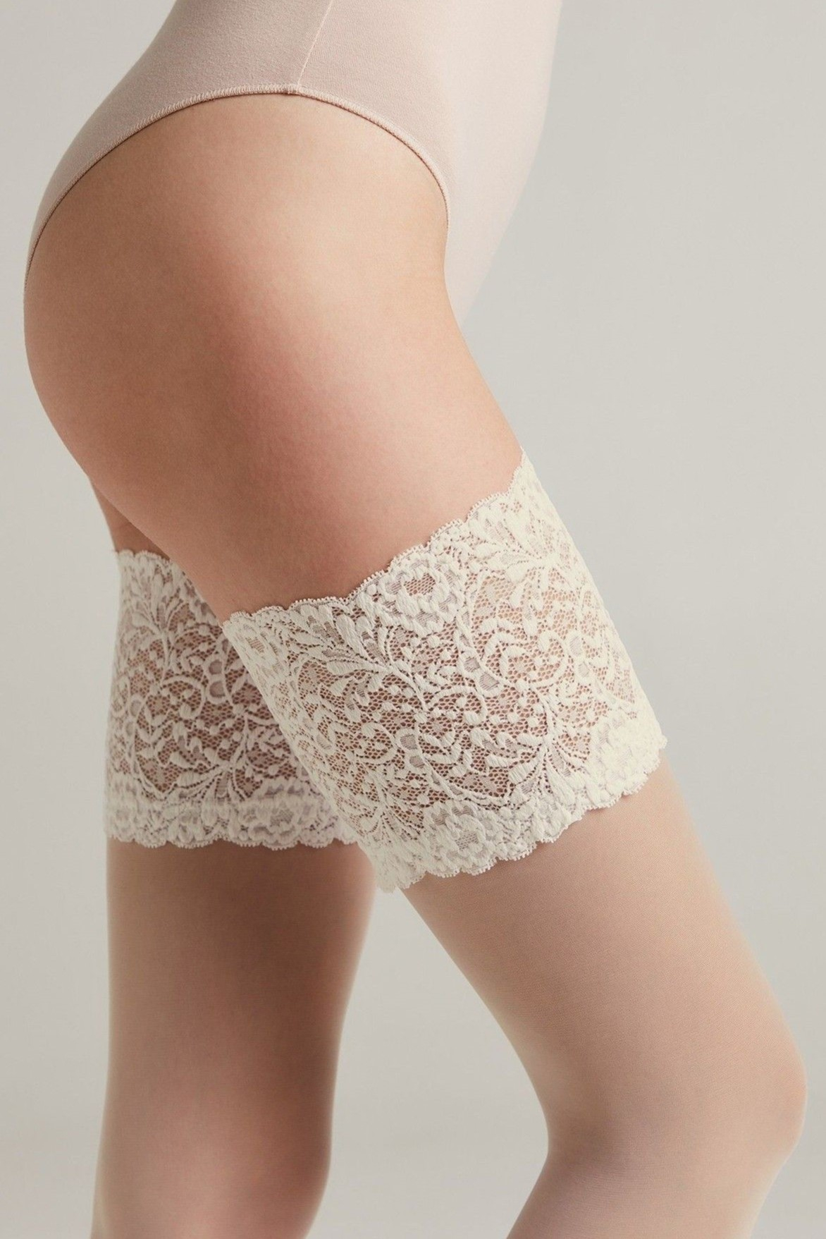 Тонкие эластичные чулки 20 ден с широкой кружевной самоподдерживающейся резинкой.