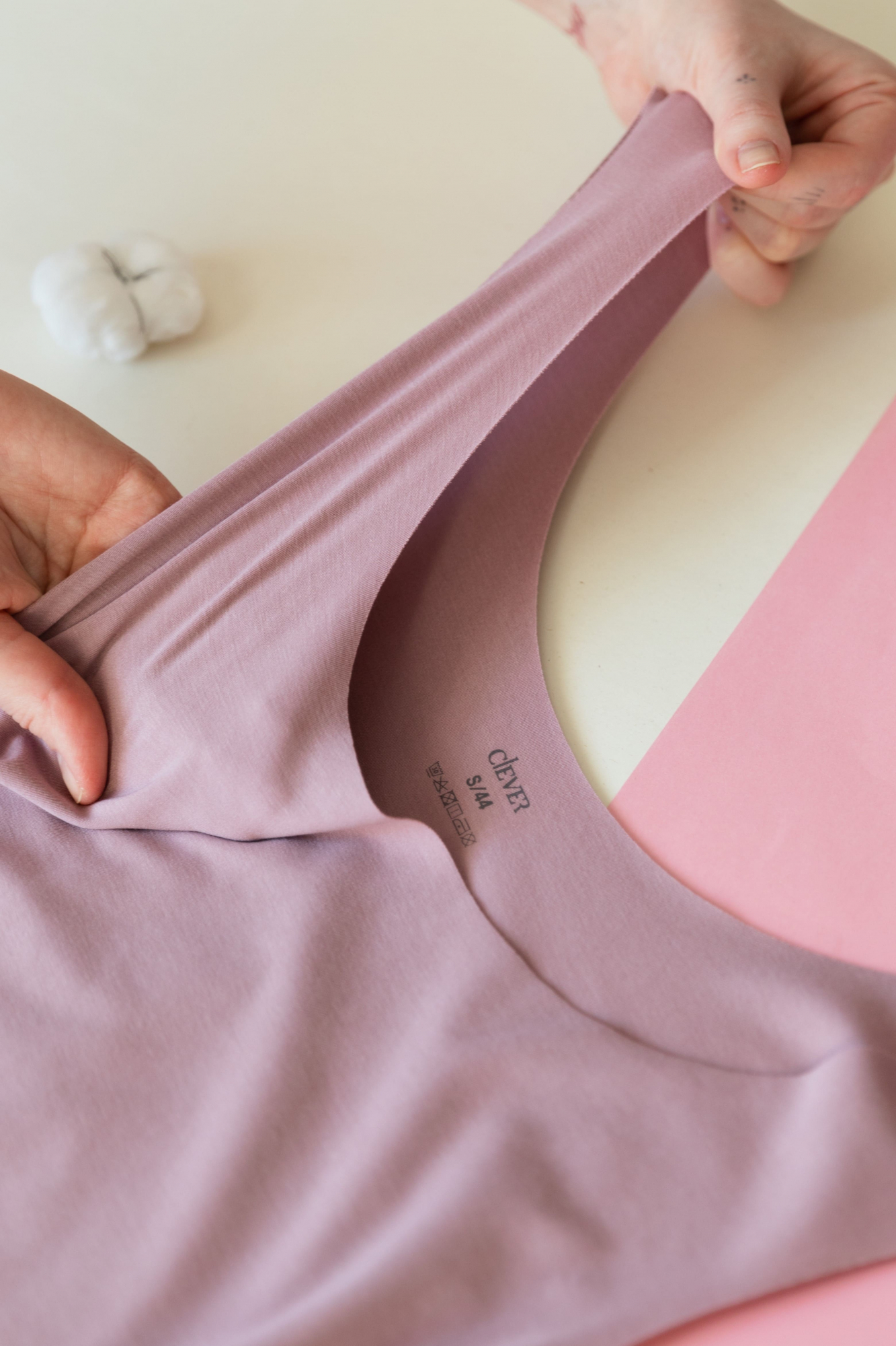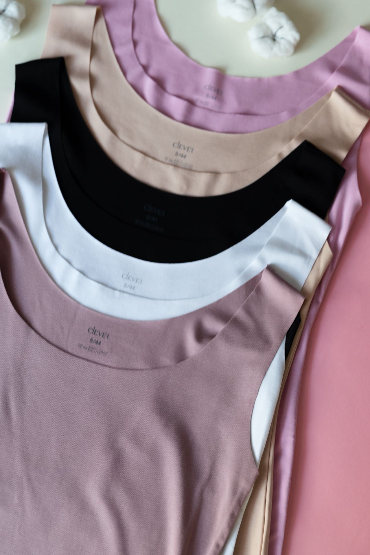 Классическая бесшовная майка приталенного силуэта на широких бретелях.