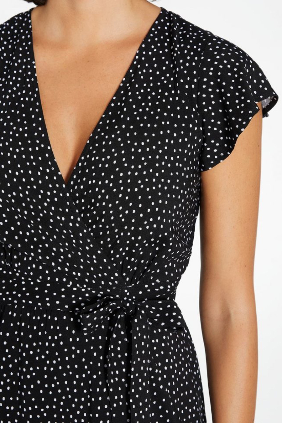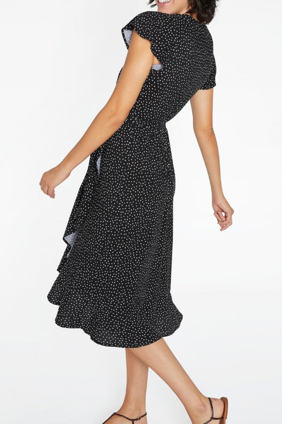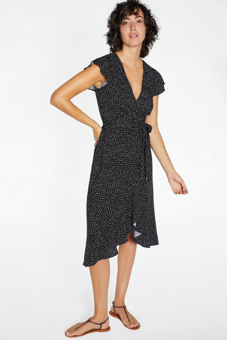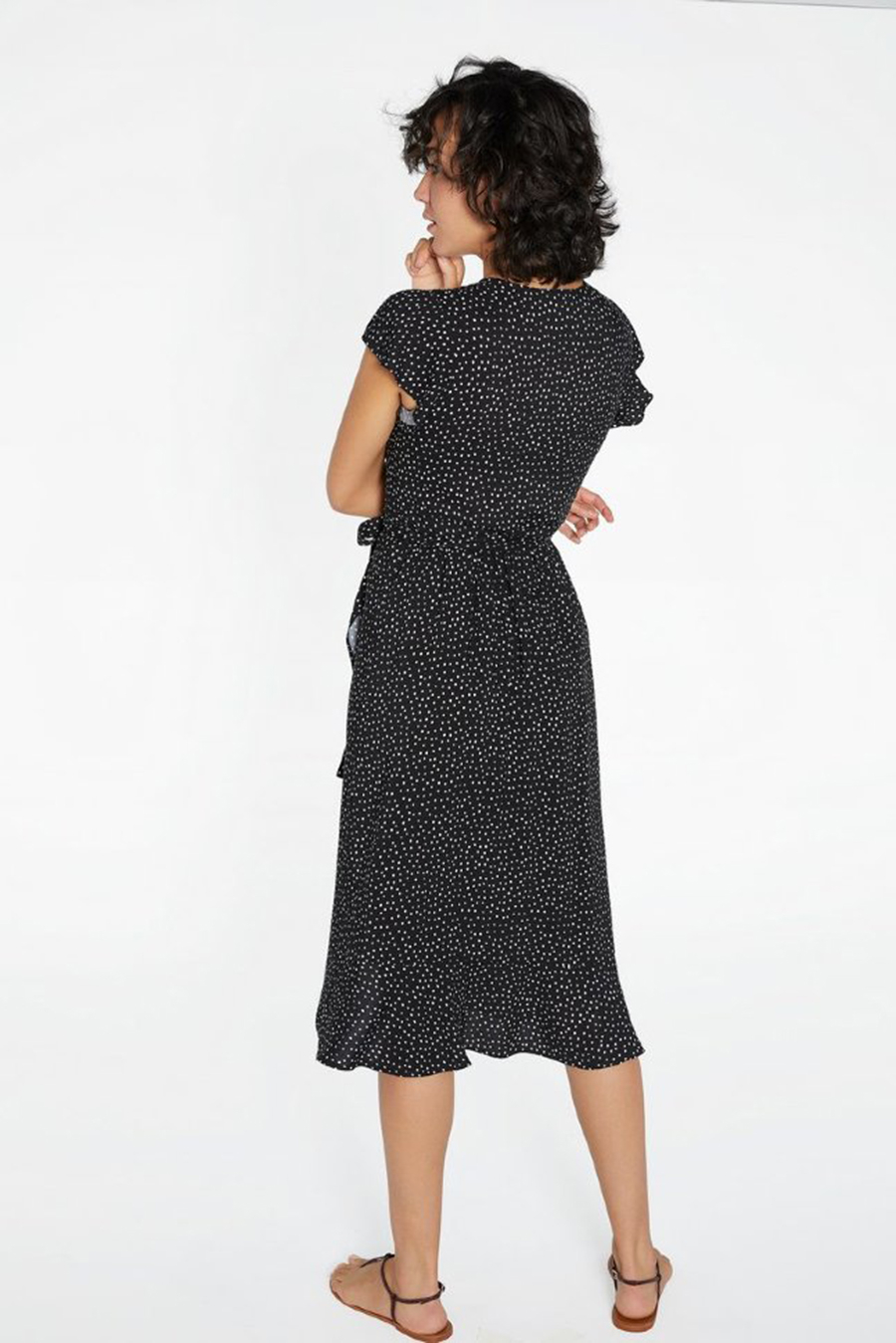 Модель длины миди, на запах, с короткими рукавами-воланами и глубоким V-образным вырезом.