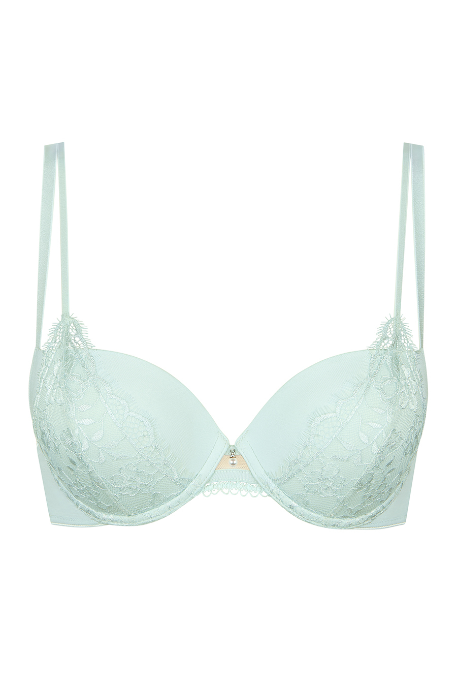 Нежное кружево на чашечках продолжается тонкими ремешками 5 мм, которые соединяются с бретелями, создавая изысканную деталь.