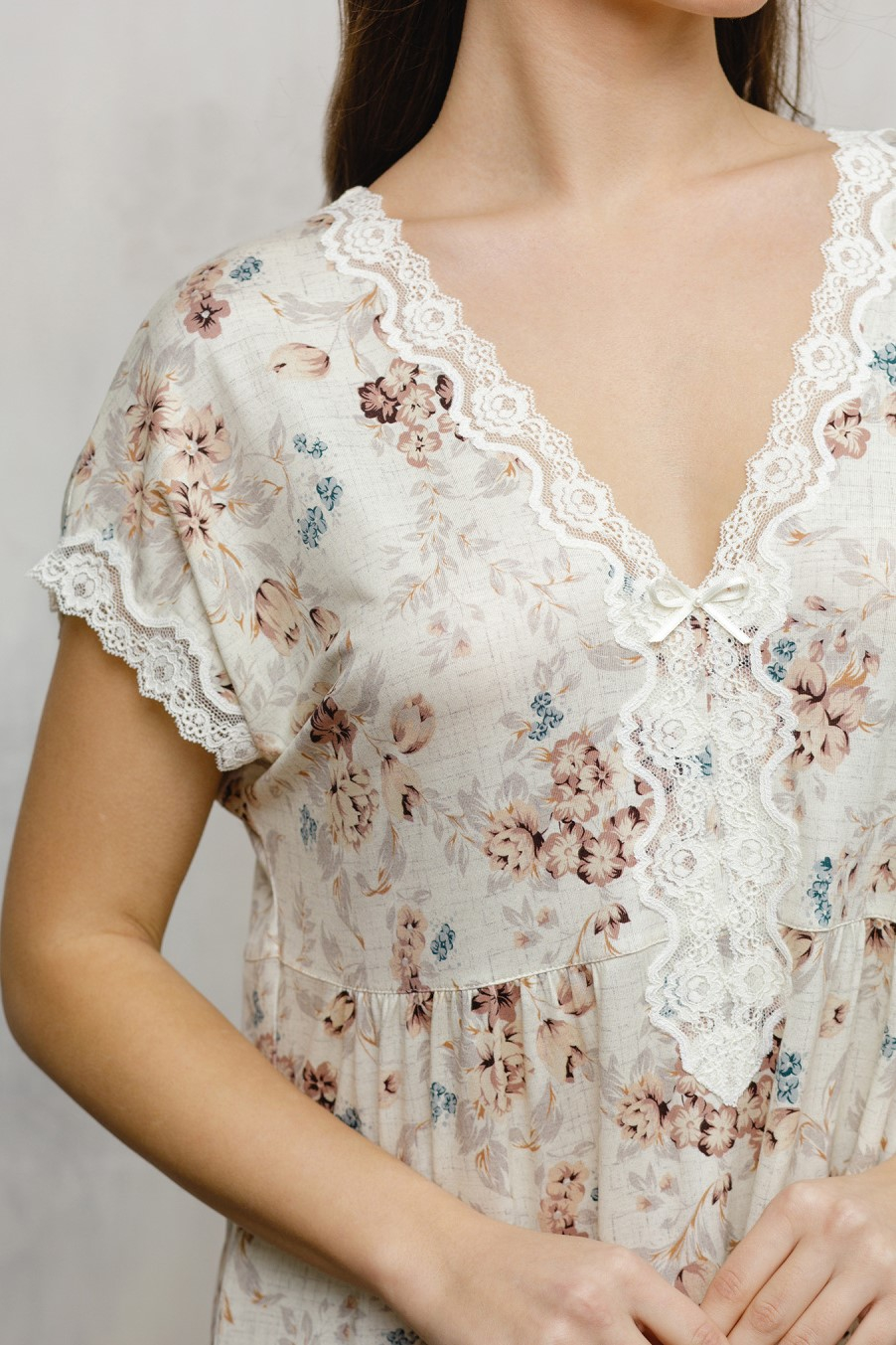 Рукава и вырез обрамляет нежное кружево в тон.