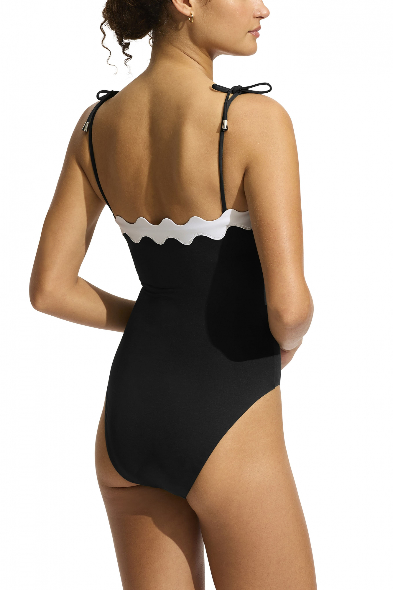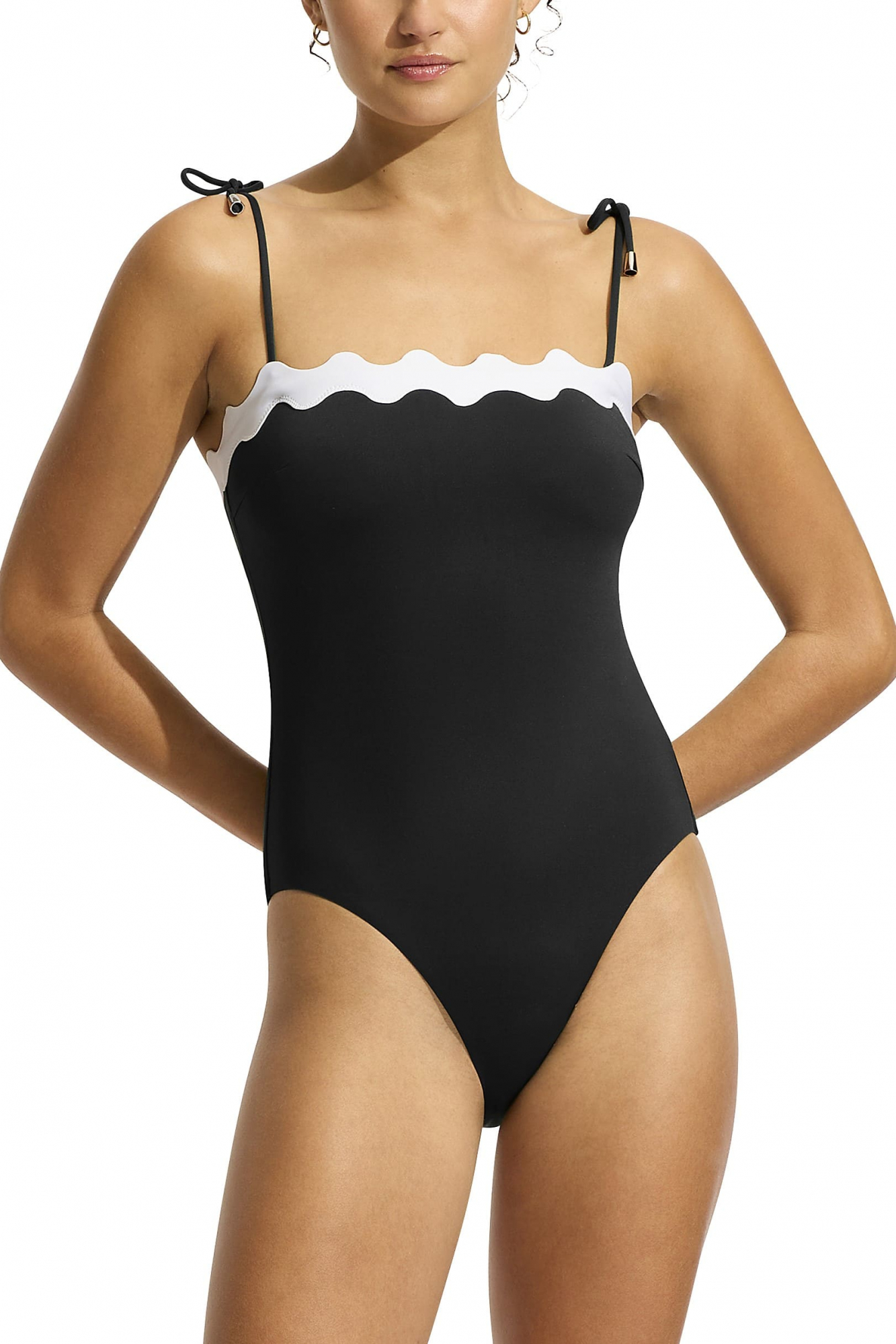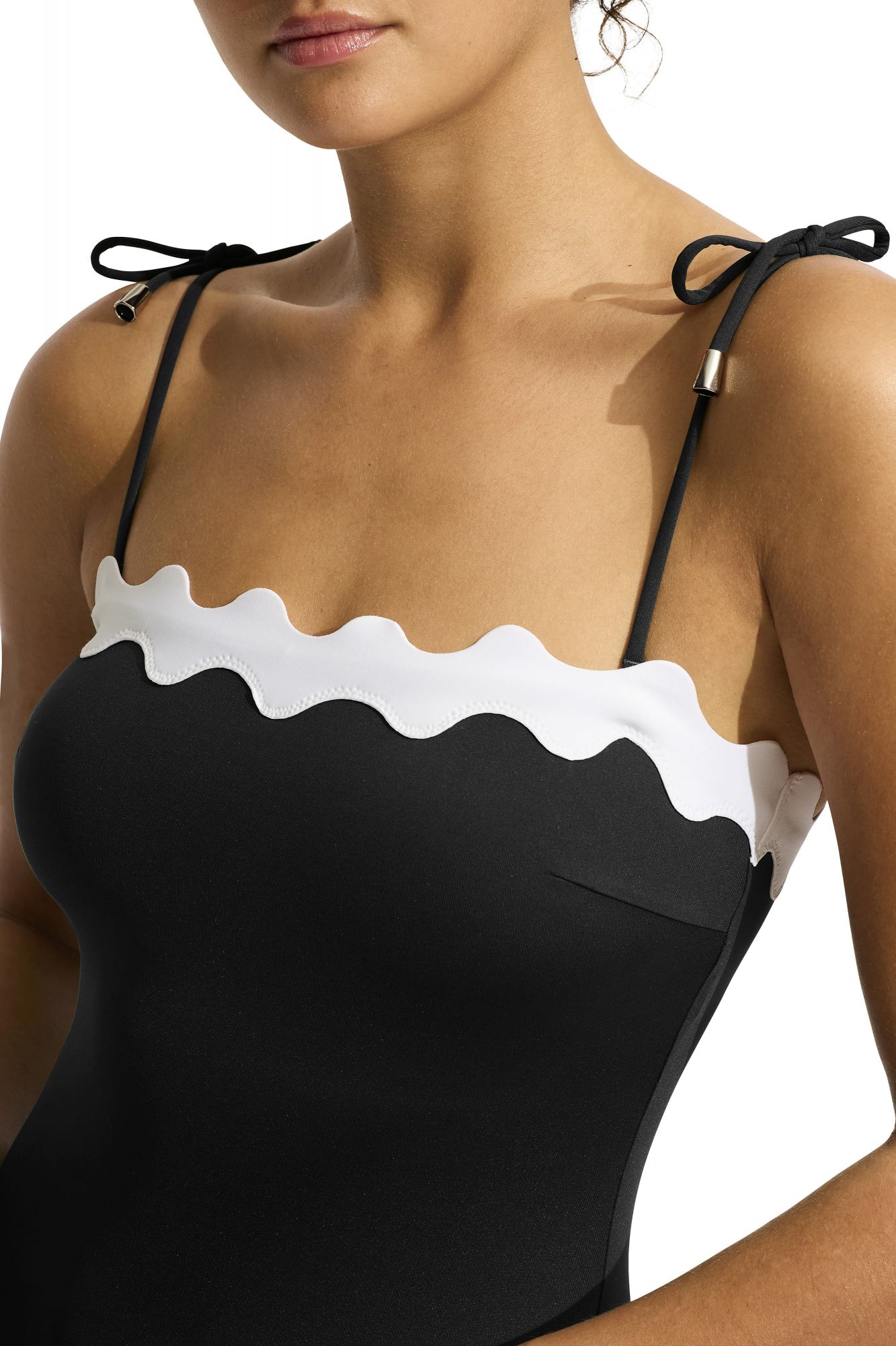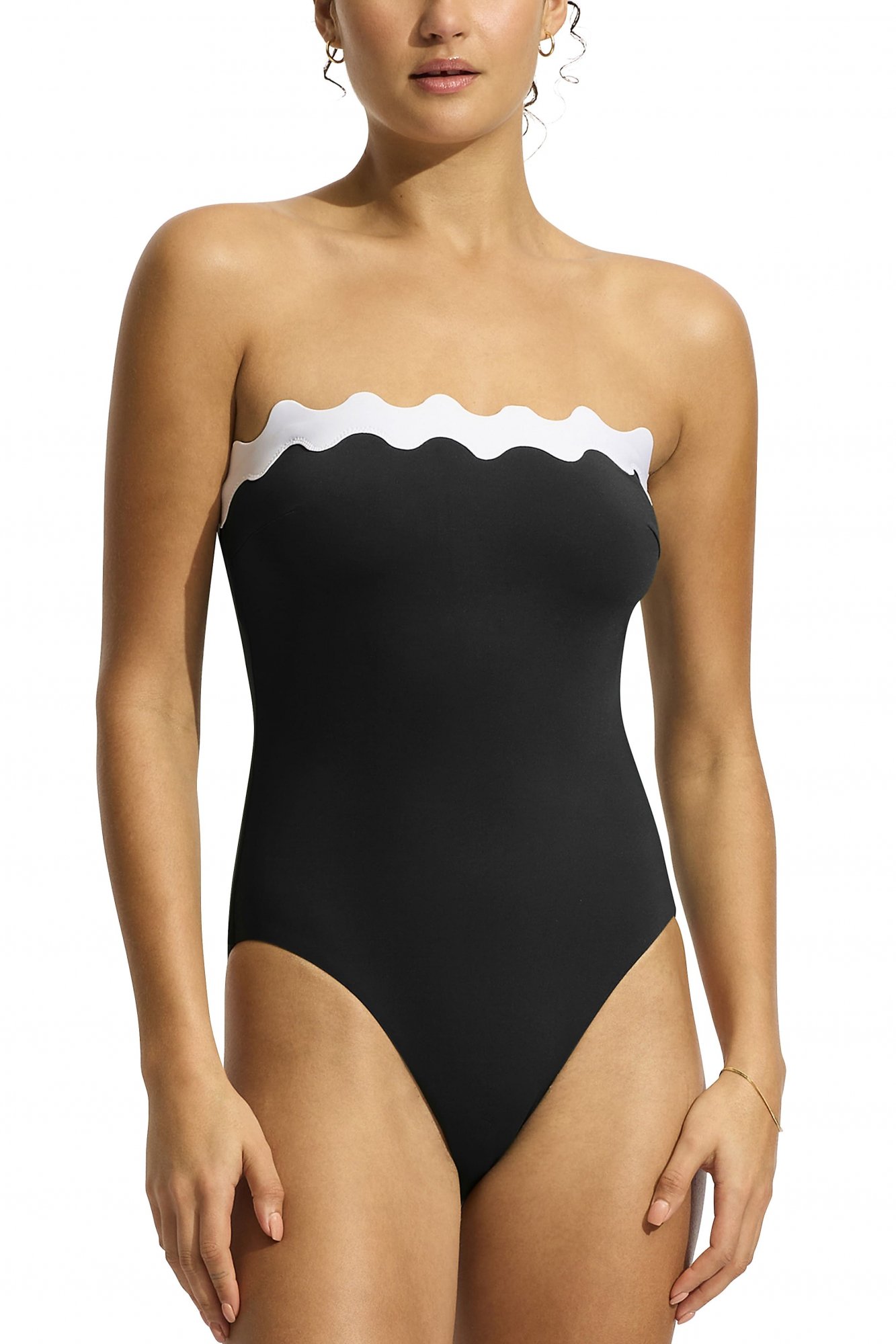 Элегантный однотонный слитный купальник-бандо с контрастной волнистой полосой по верху бюста.