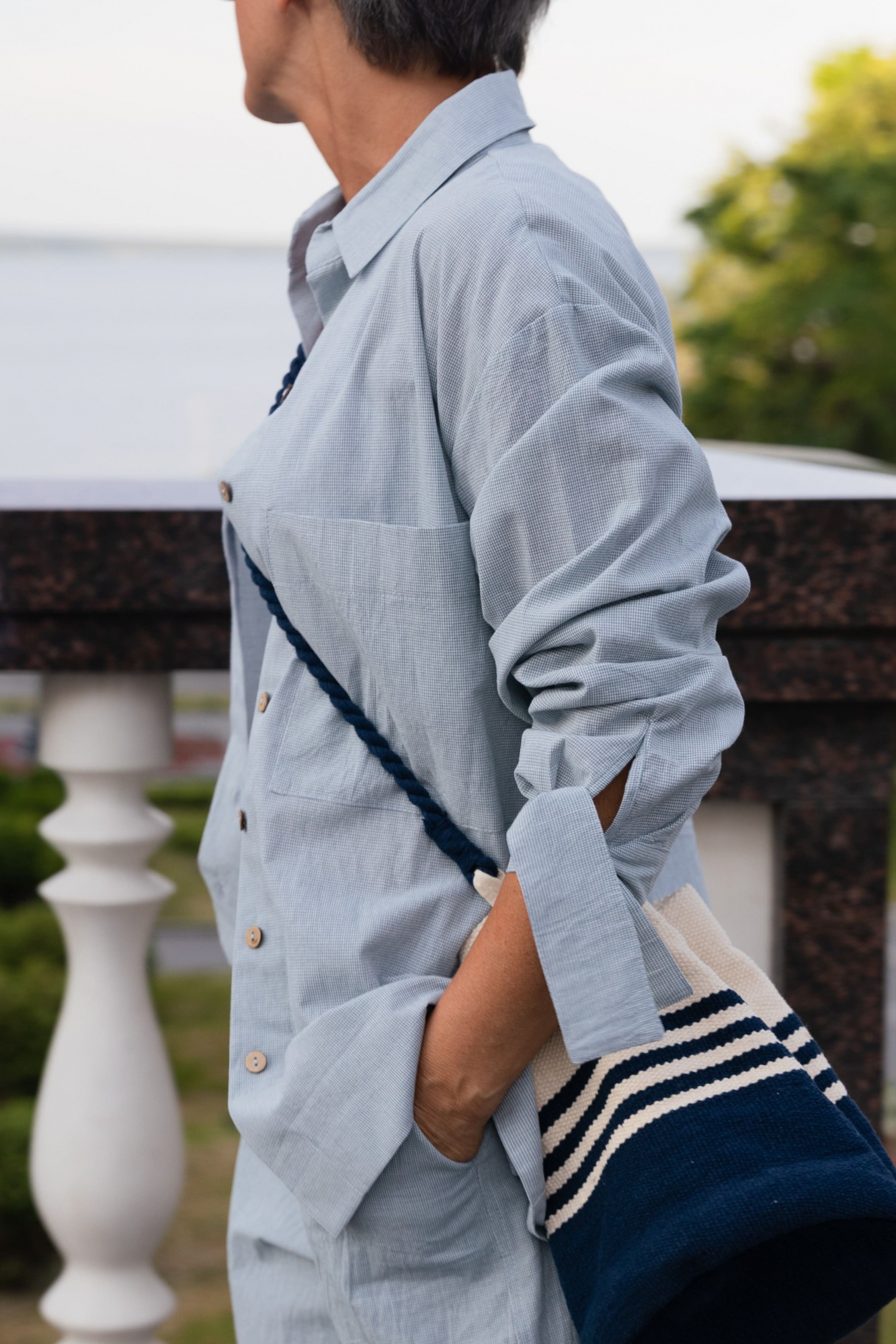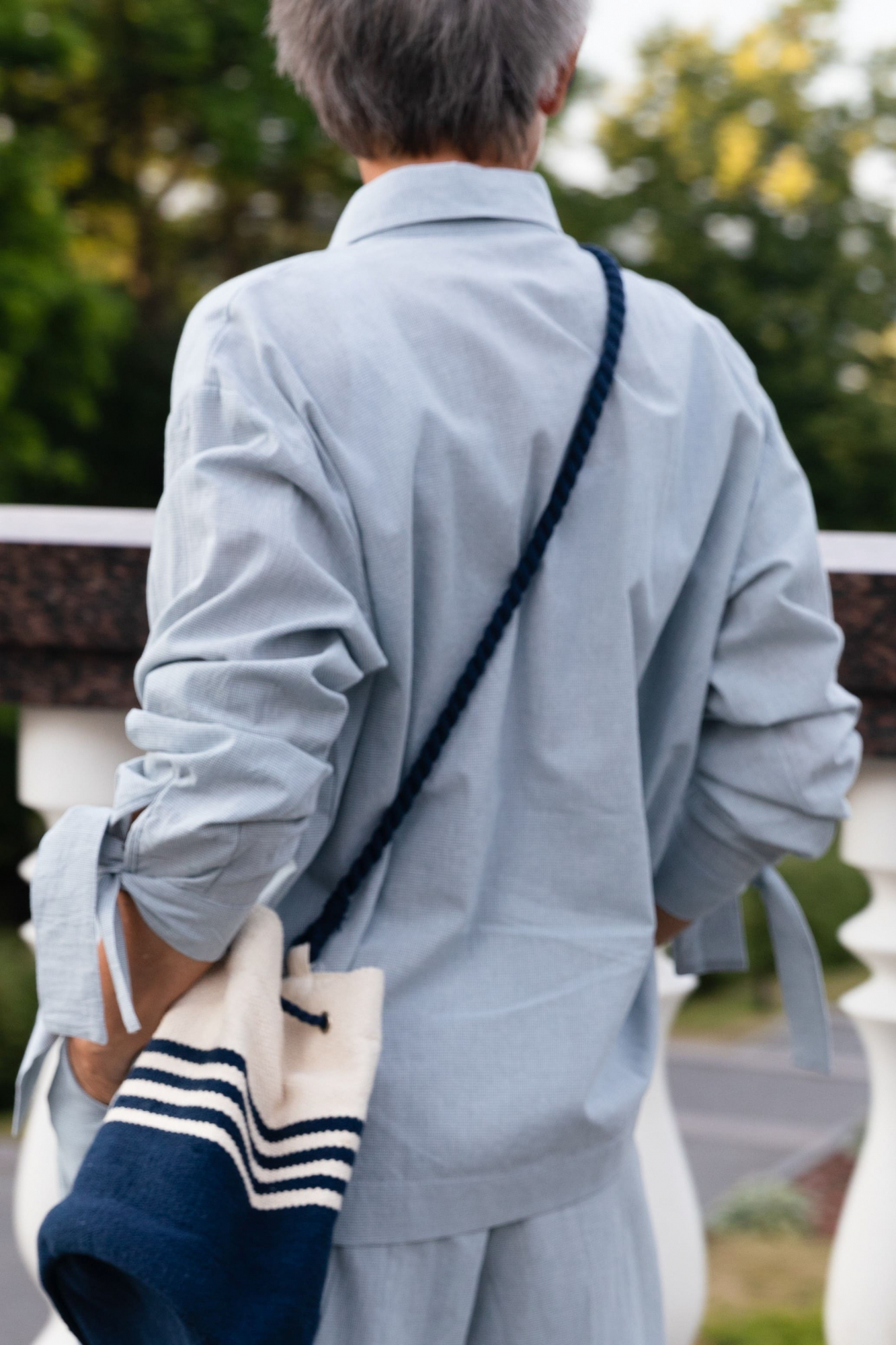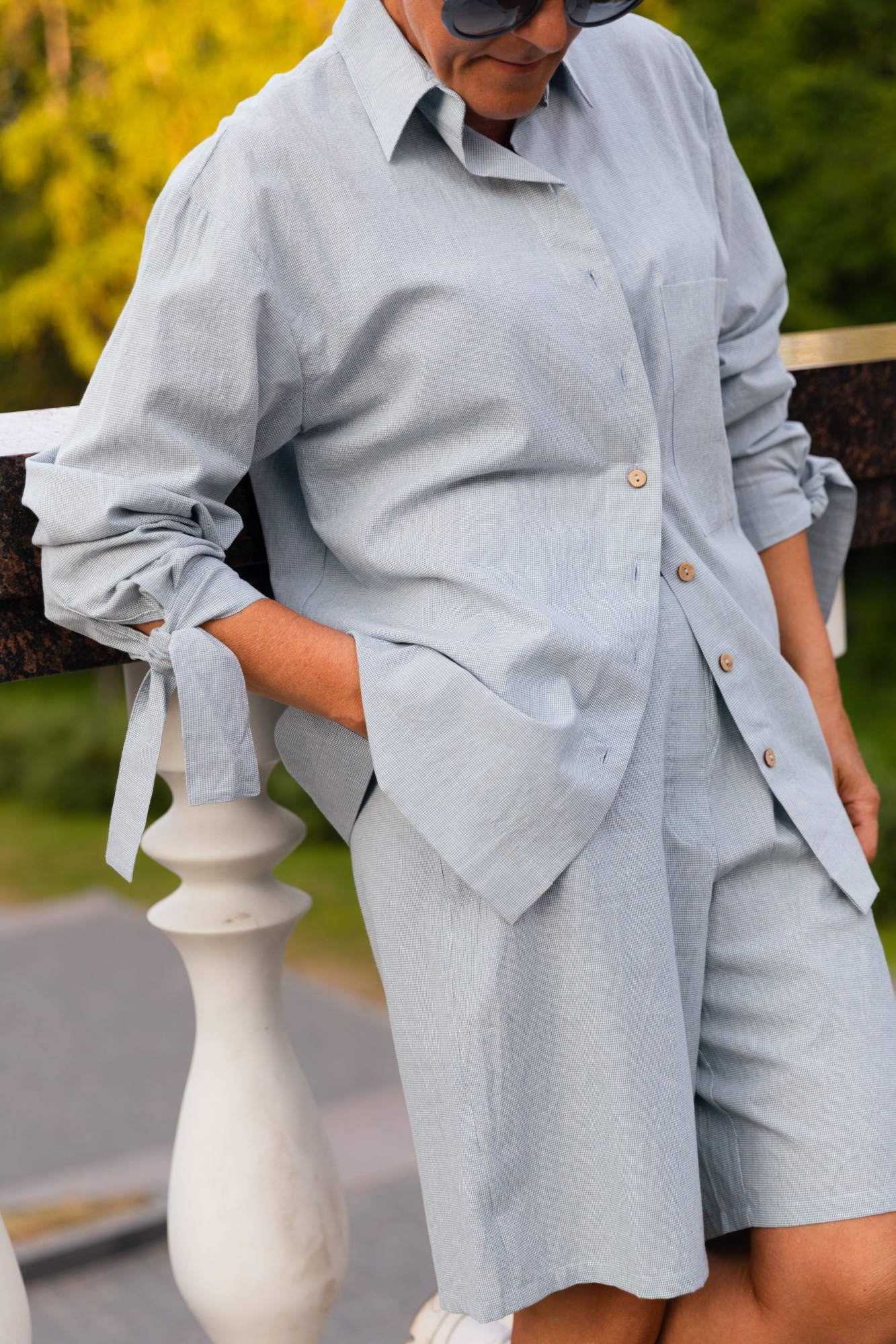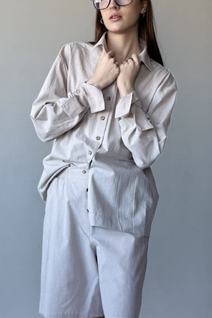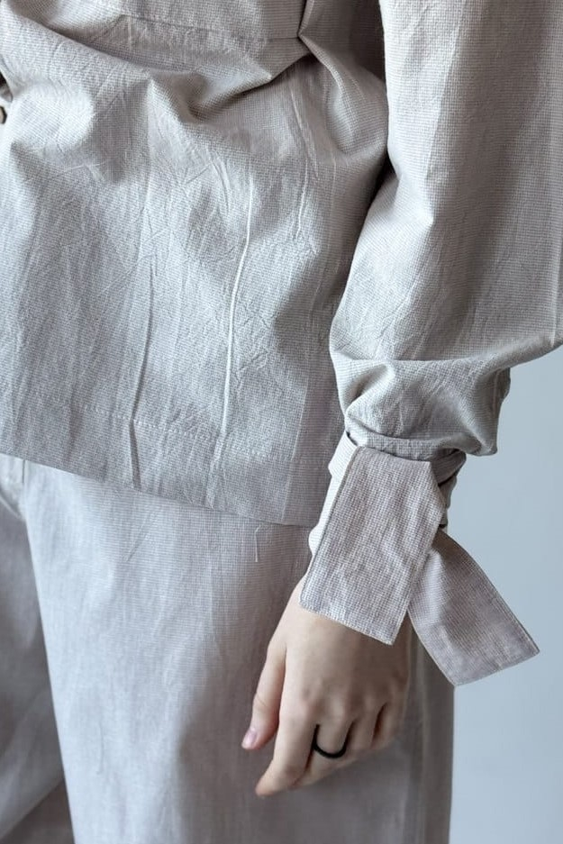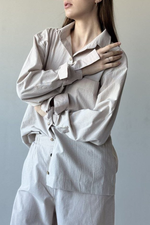 Модель выполнена из вареного хлопка, который придает ткани легкий эффект помятости и подчеркивает натуральную структуру ткани.