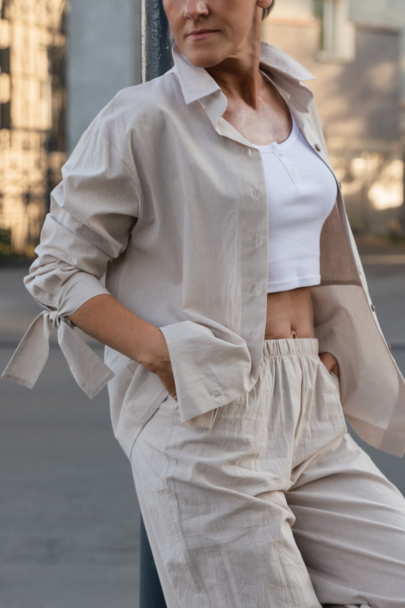 Стильная блуза рубашечного кроя со свободным силуэтом и длинными рукавами.