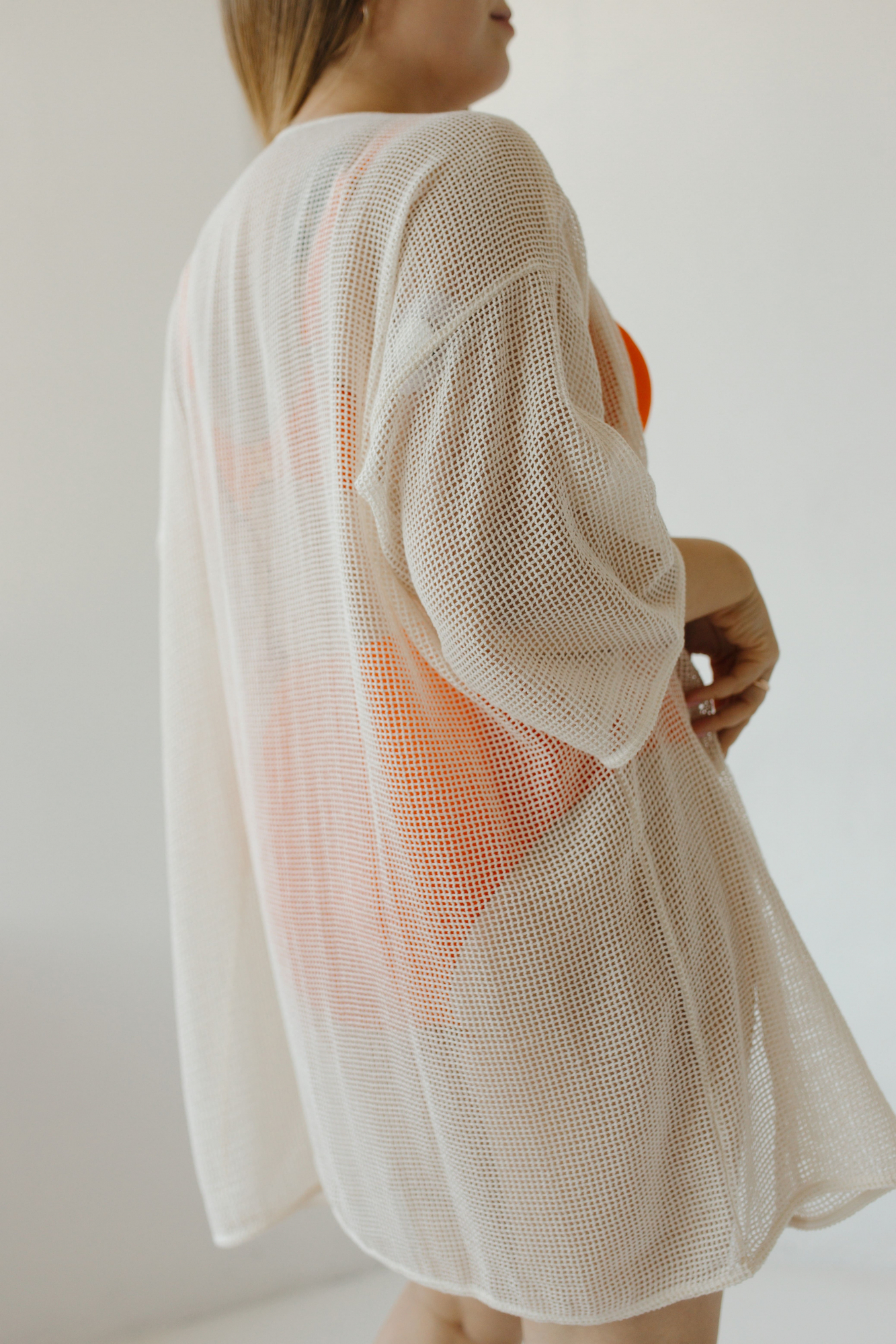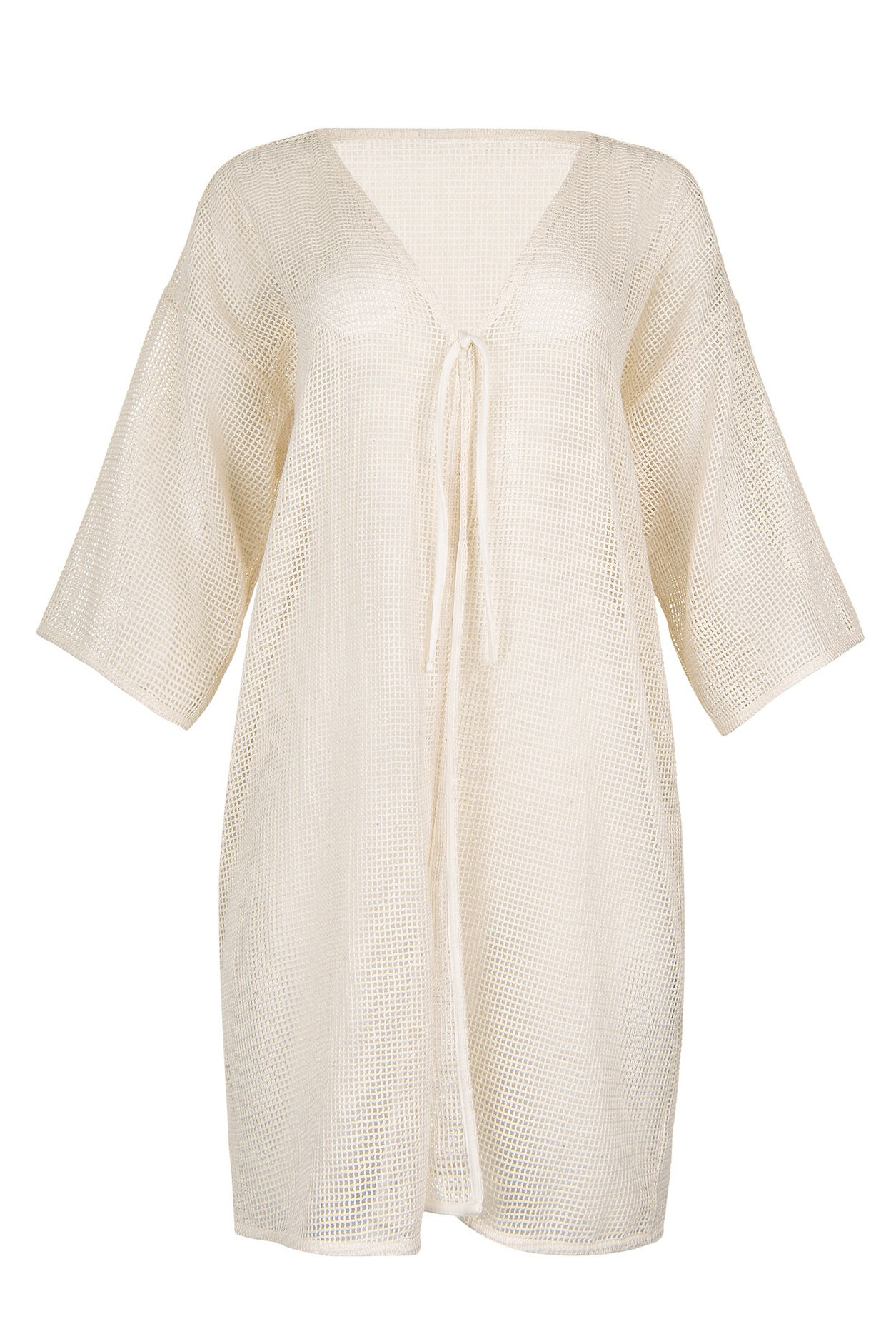 Короткая пляжная туника с рукавами ¾ и V-образным вырезом завязывается в области груди.