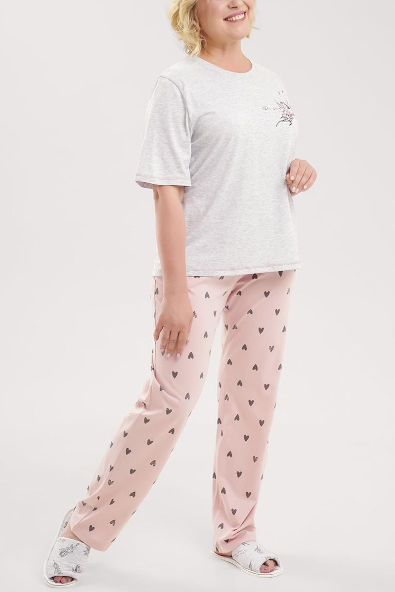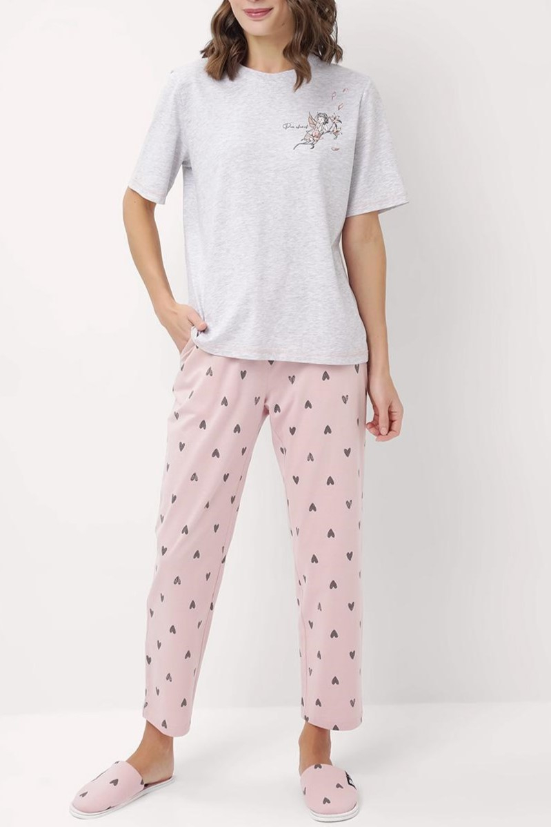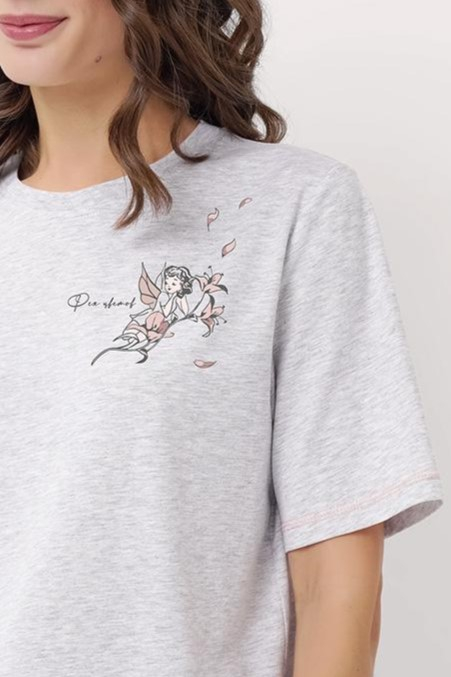 Верх пижамы – футболка с короткими рукавами и круглым вырезом, которая украшена сбоку милым рисунком.