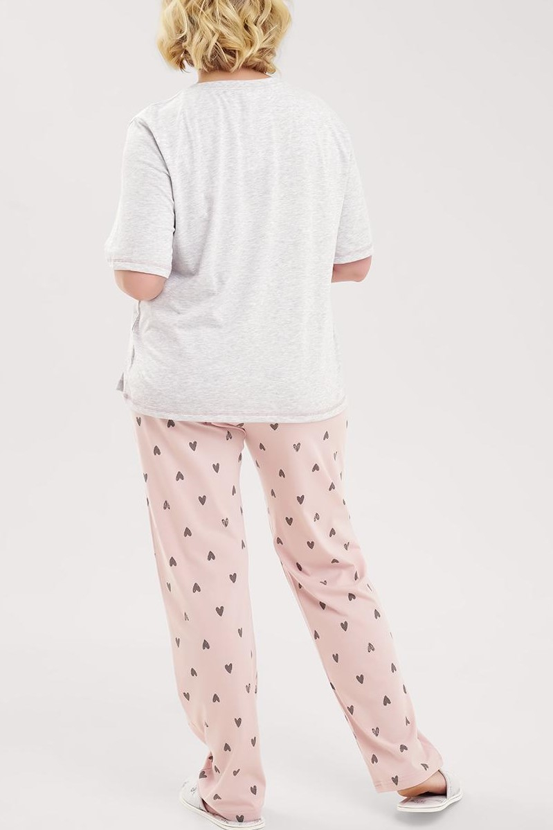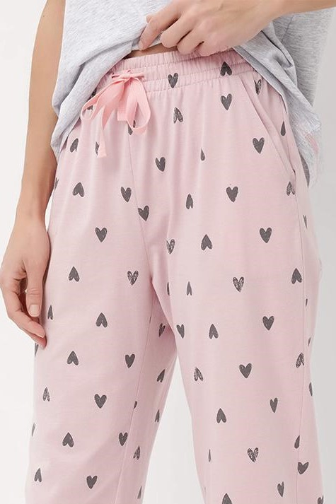 Низ – брюки с широким эластичным поясом на завязках и принтом в сердечко.