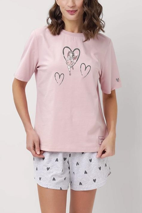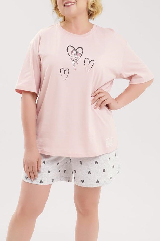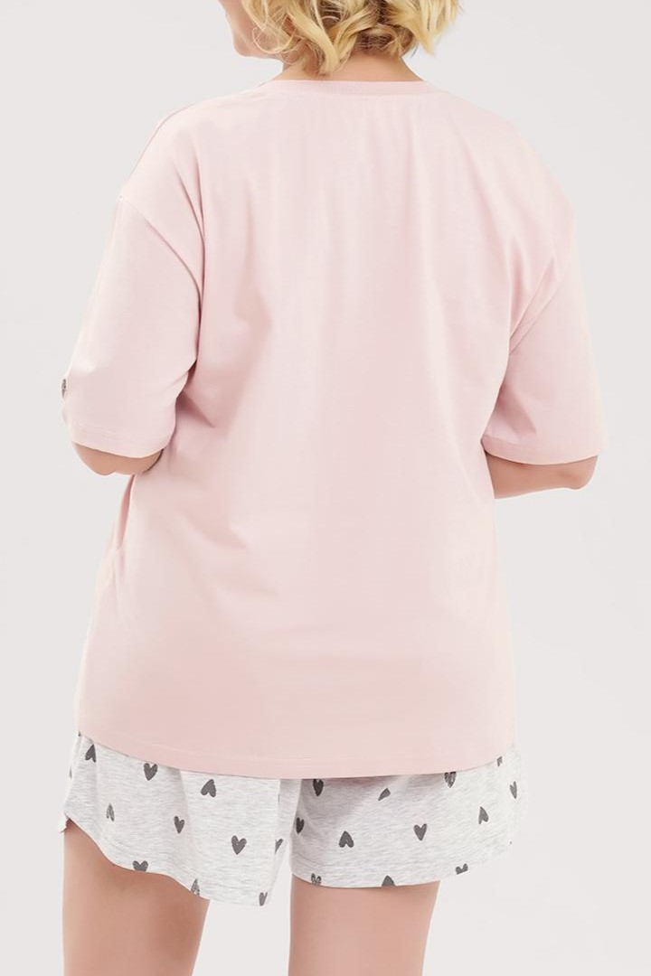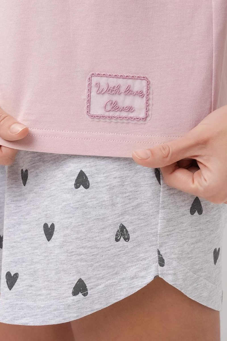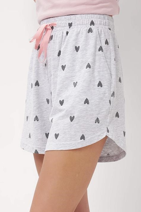 Низ – короткие свободные шортики с широким эластичным поясом на завязках и принтом в сердечко.