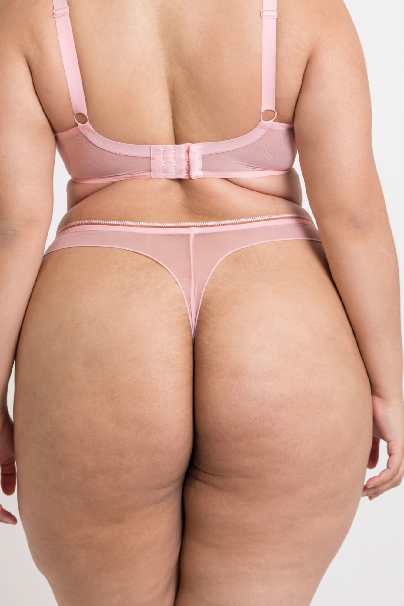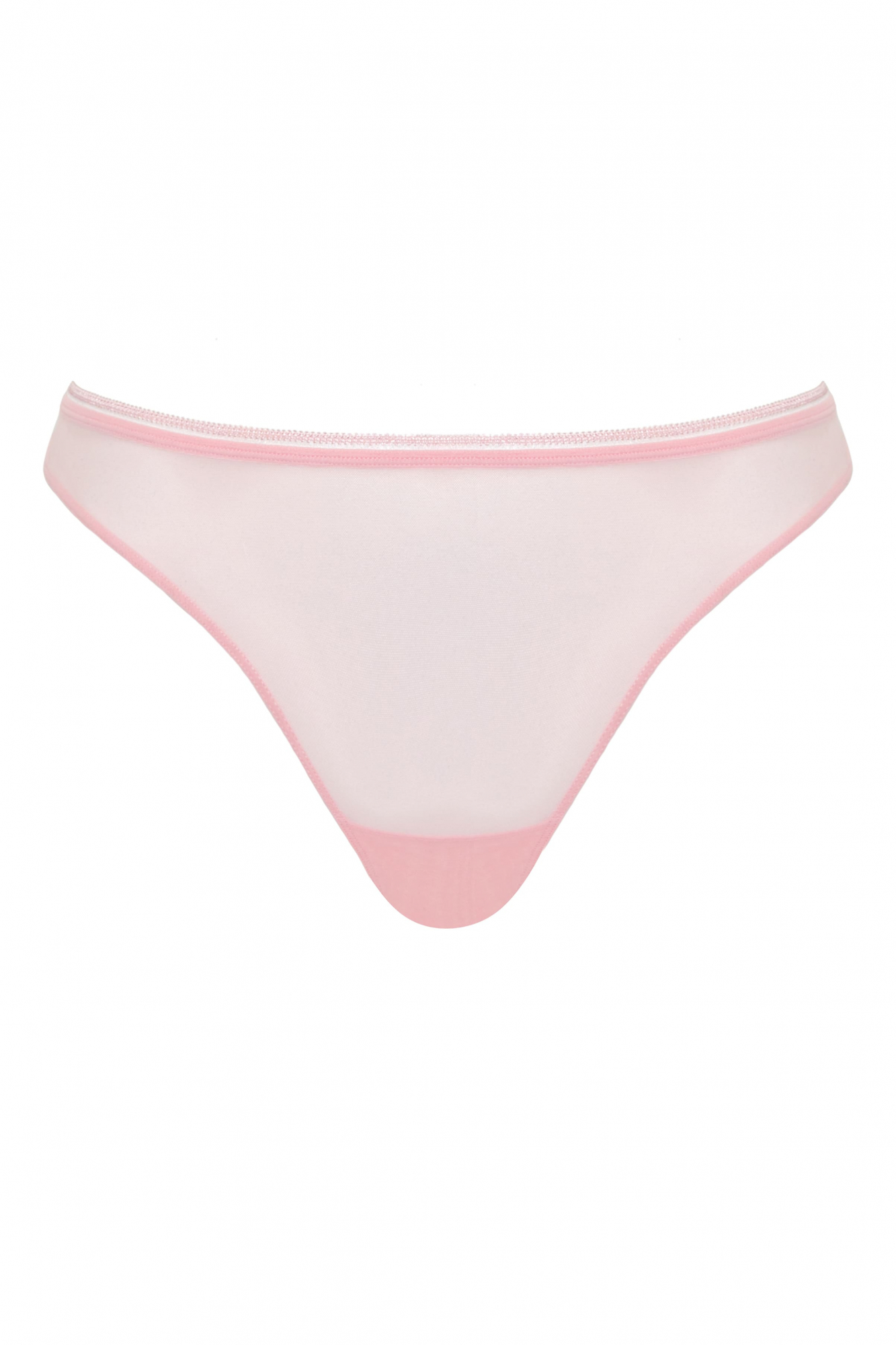 Трусики выполнены из тонкой прозрачной сеточки в нежно-розовом цвете, дополнены ажурной каемкой по поясу.