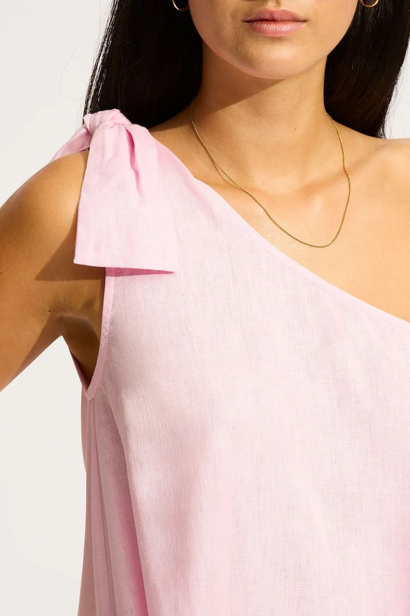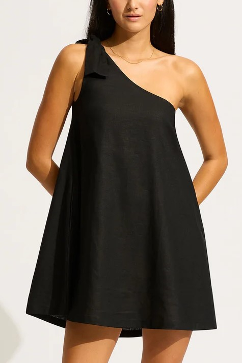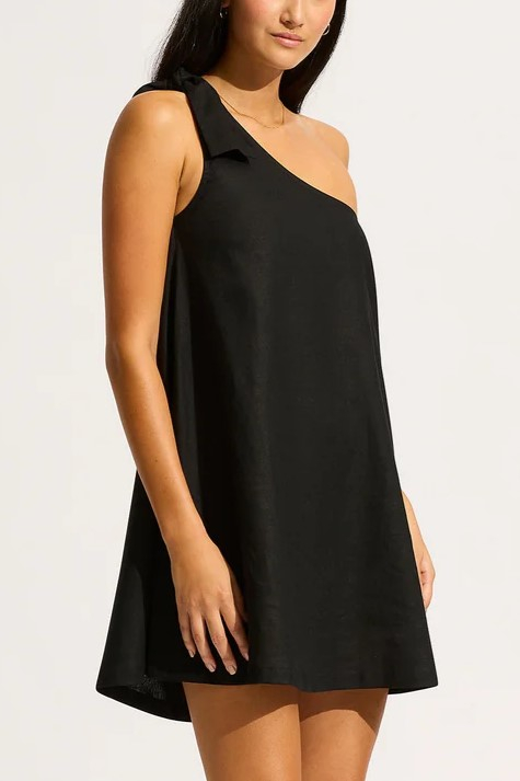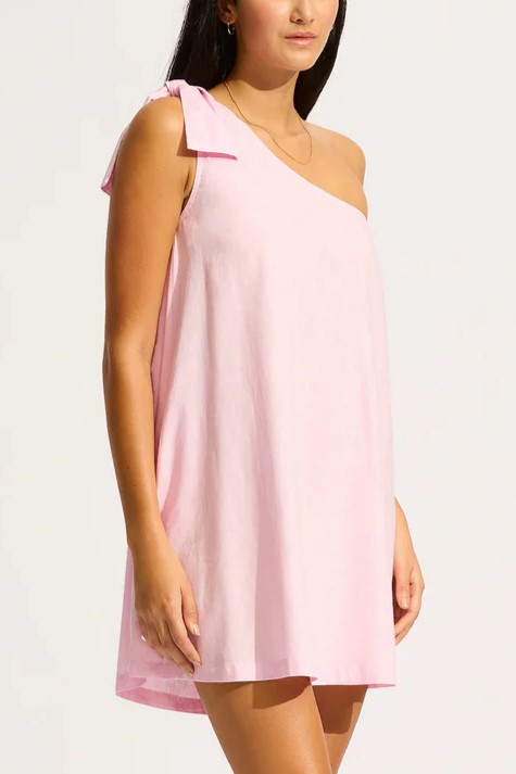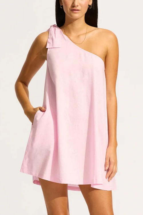 Легкое пляжное мини-платье А-силуэта ассиметричного кроя на одно плечо.