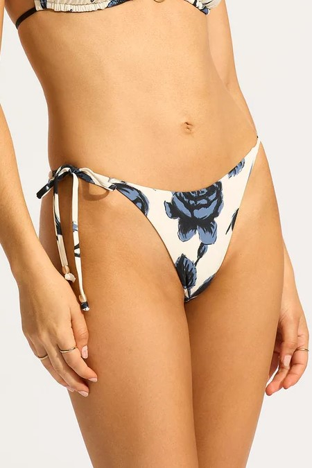 Изящные купальные плавки-бразилианы с заниженной линией талии в завораживающем растительном принте.