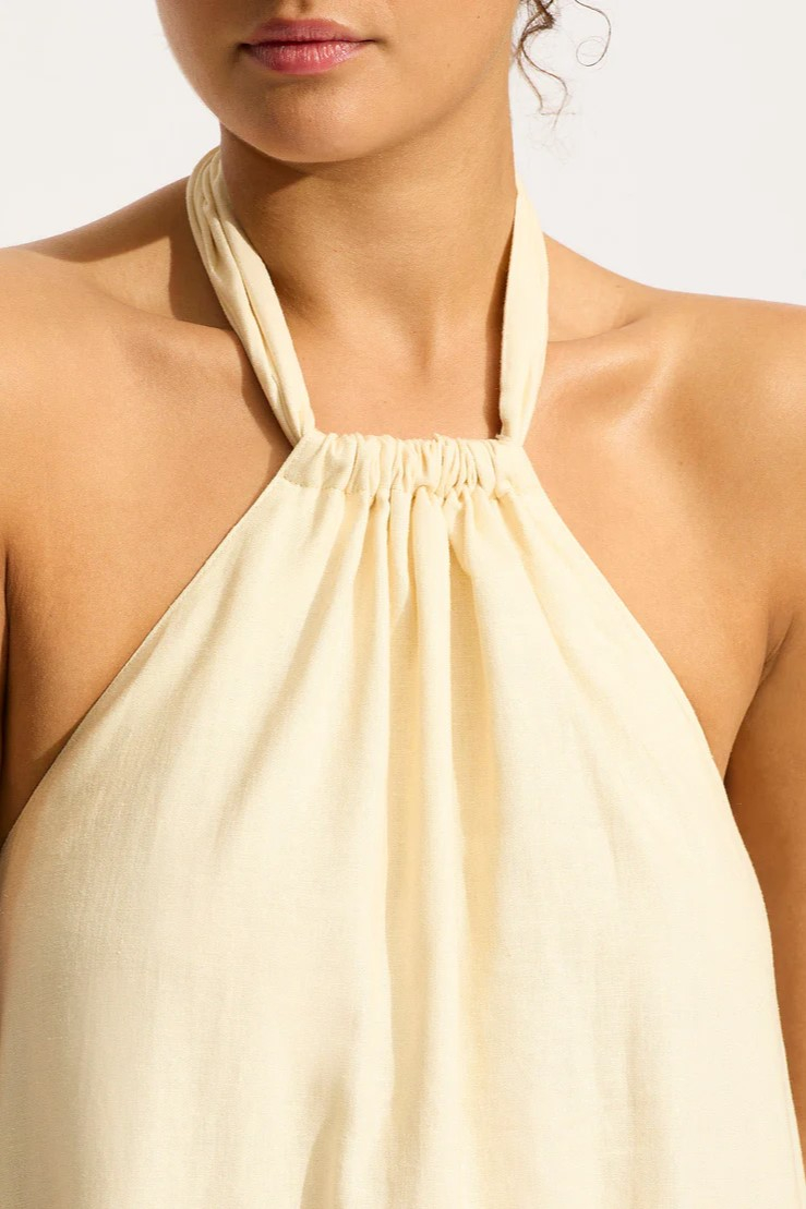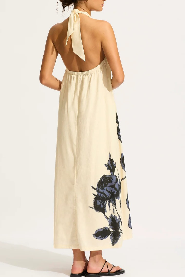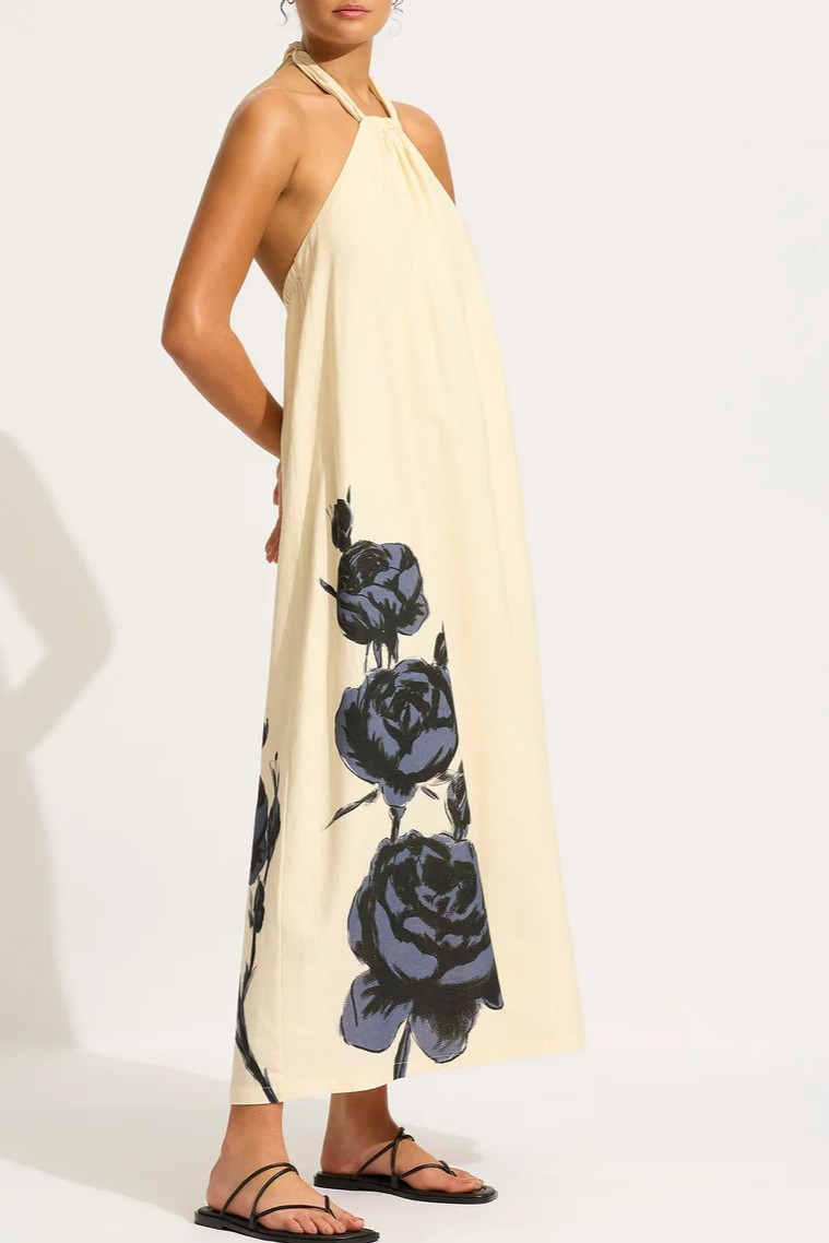 Платье открывает плечи, завязывается на шее, поэтому есть возможность регулировать посадку.