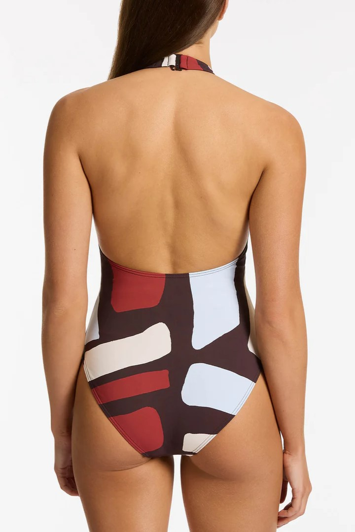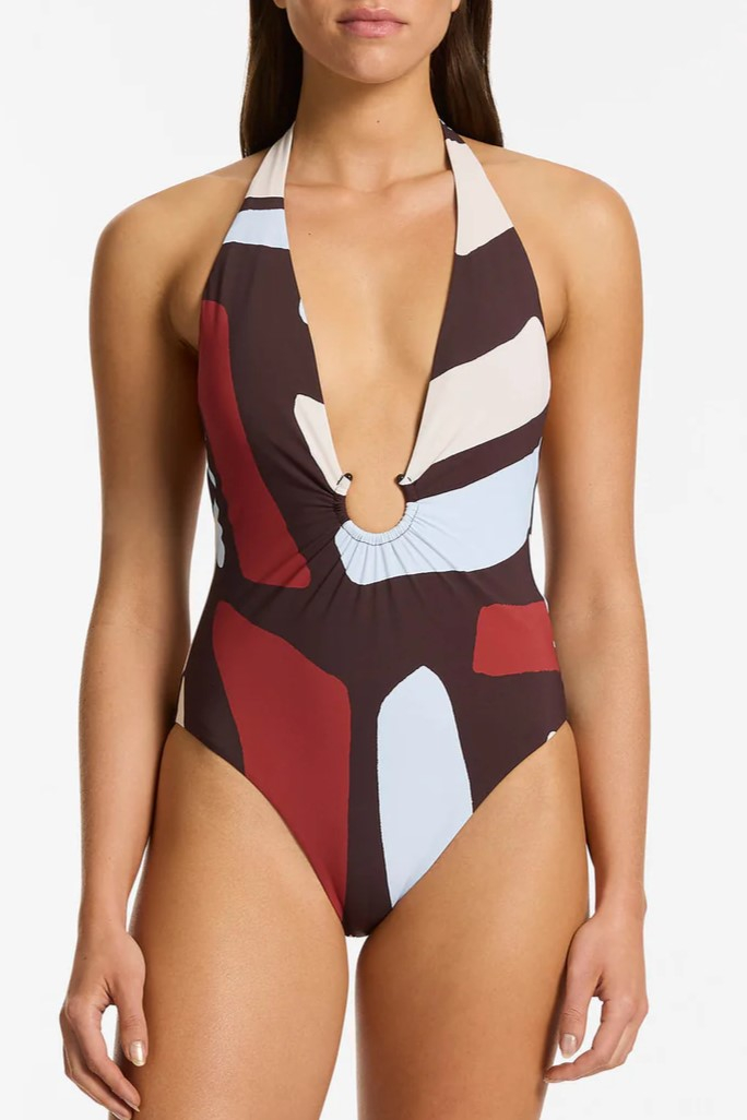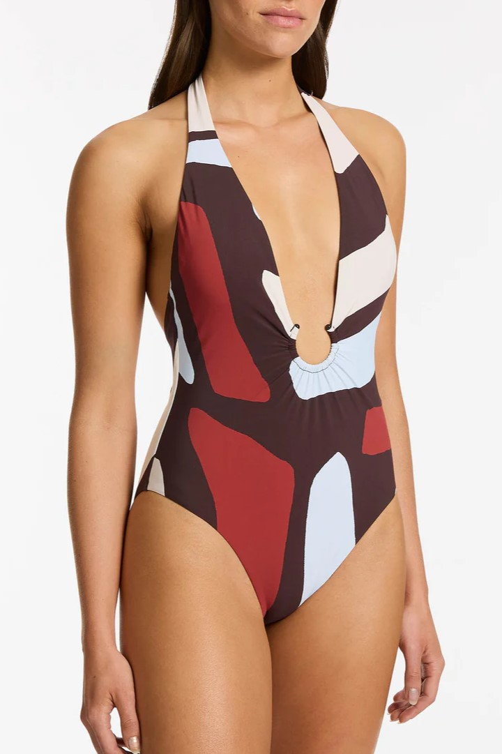 Стильный слитный купальник, выполненный из матовой ткани в абстрактном принте.