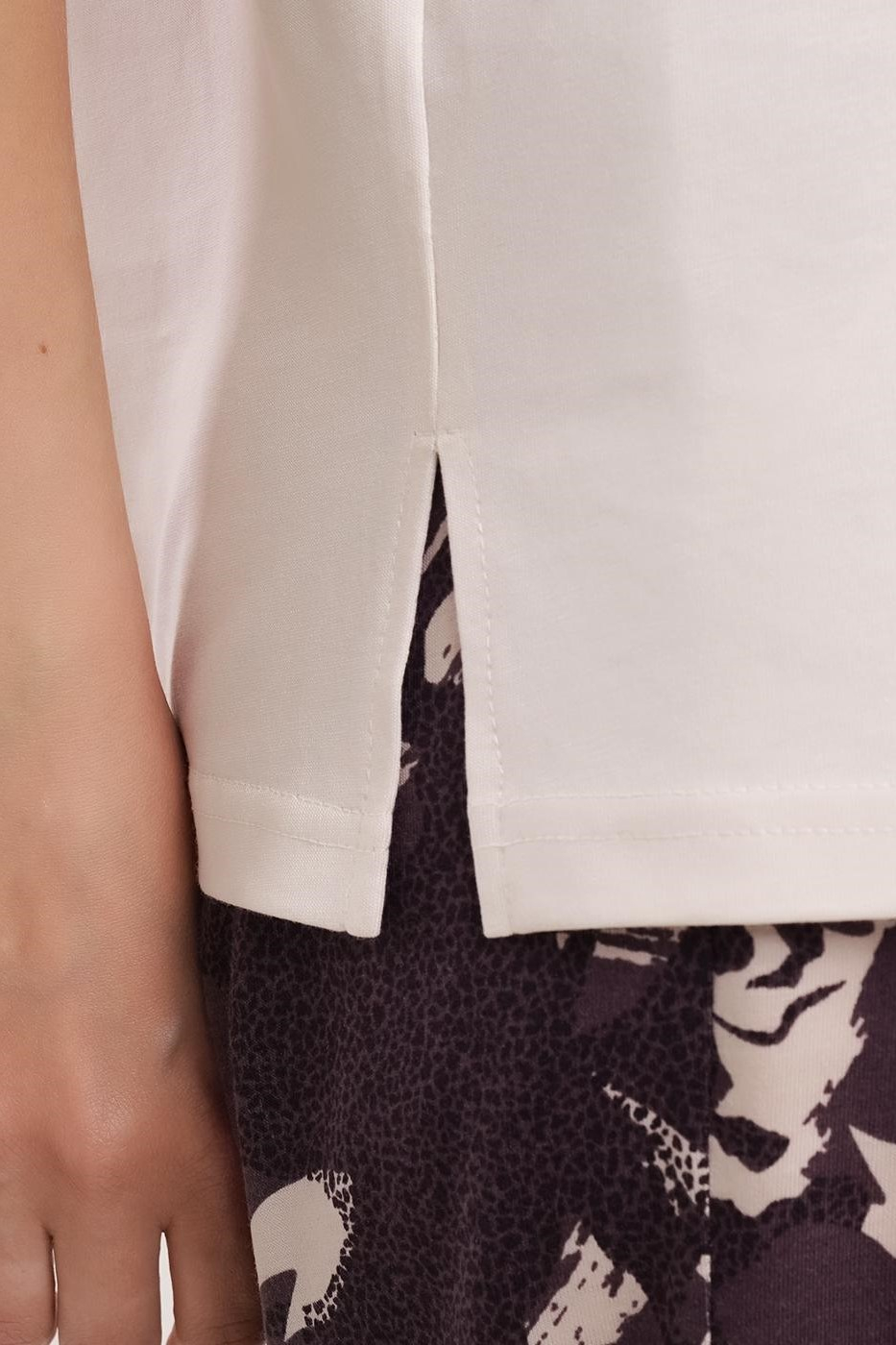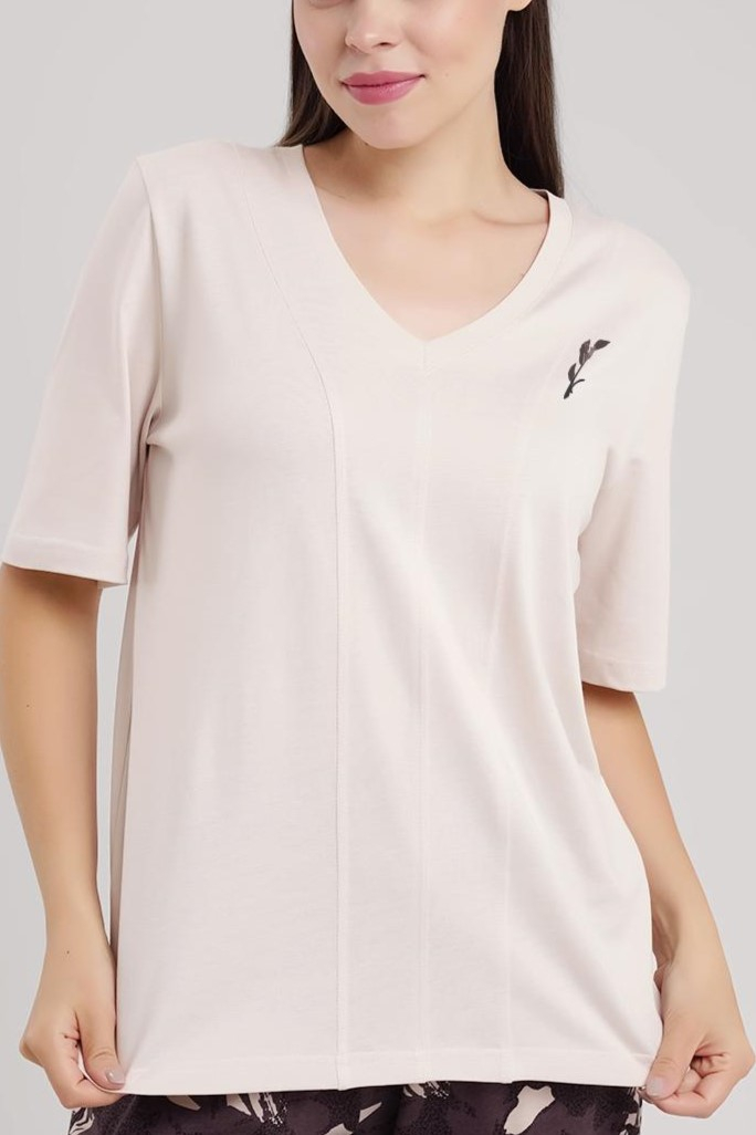 Футболка свободного прямого силуэта с короткими рукавами и V-образным вырезом. По центру три вертикальных шва визуально вытягивают силуэт. На груди сбоку небольшой рисунок веточки. По бокам разрезы для большей свободы движений.