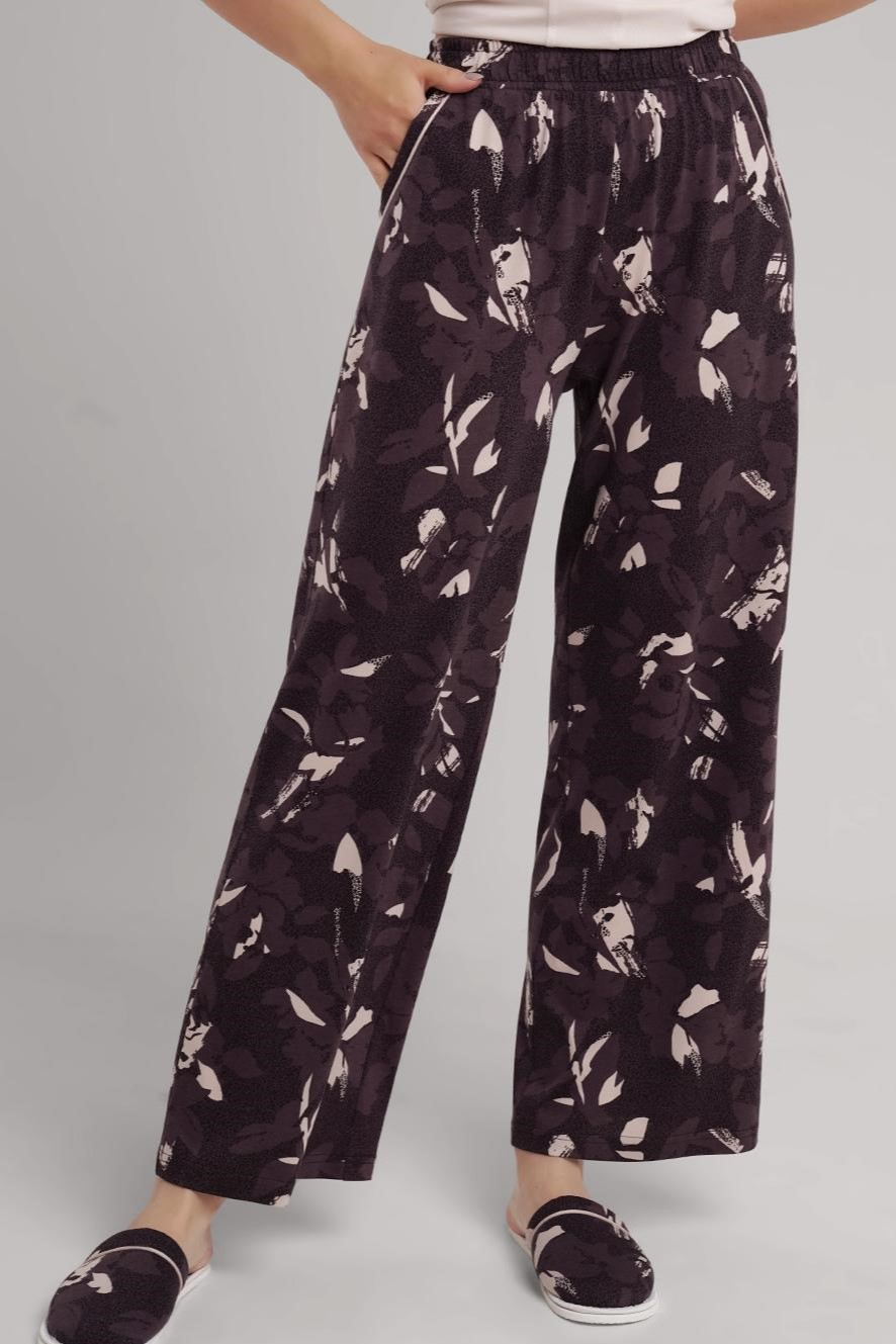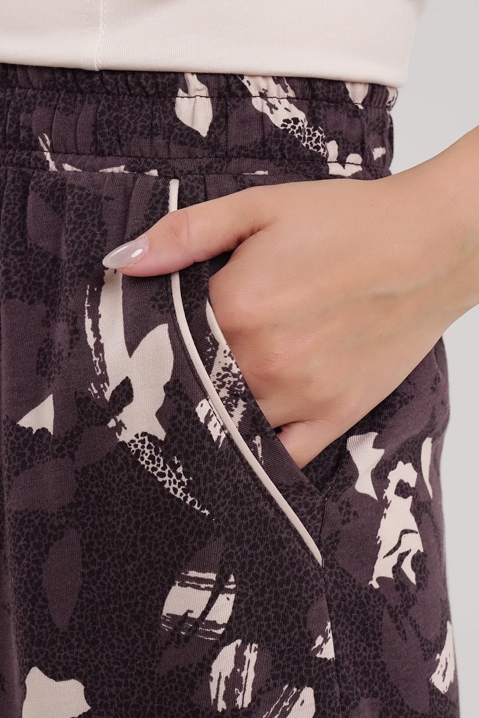 Брюки свободного кроя в абстрактном принте. На талии мягкая широкая резинка, по бокам удобные карманы.