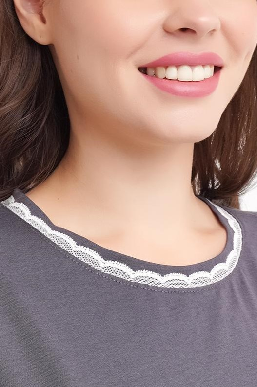 Модель с короткими рукавами ½ и круглым вырезом, который обрамлен белым кружевом.