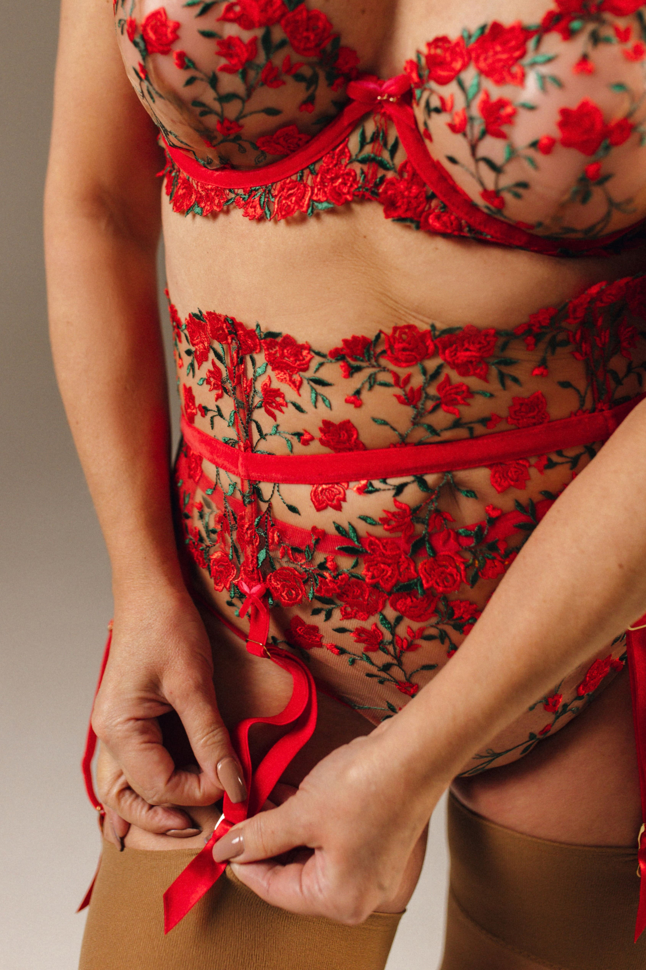Пояс украшен цветочной вышивкой, россыпью красных роз на тонких зеленых стебельках.