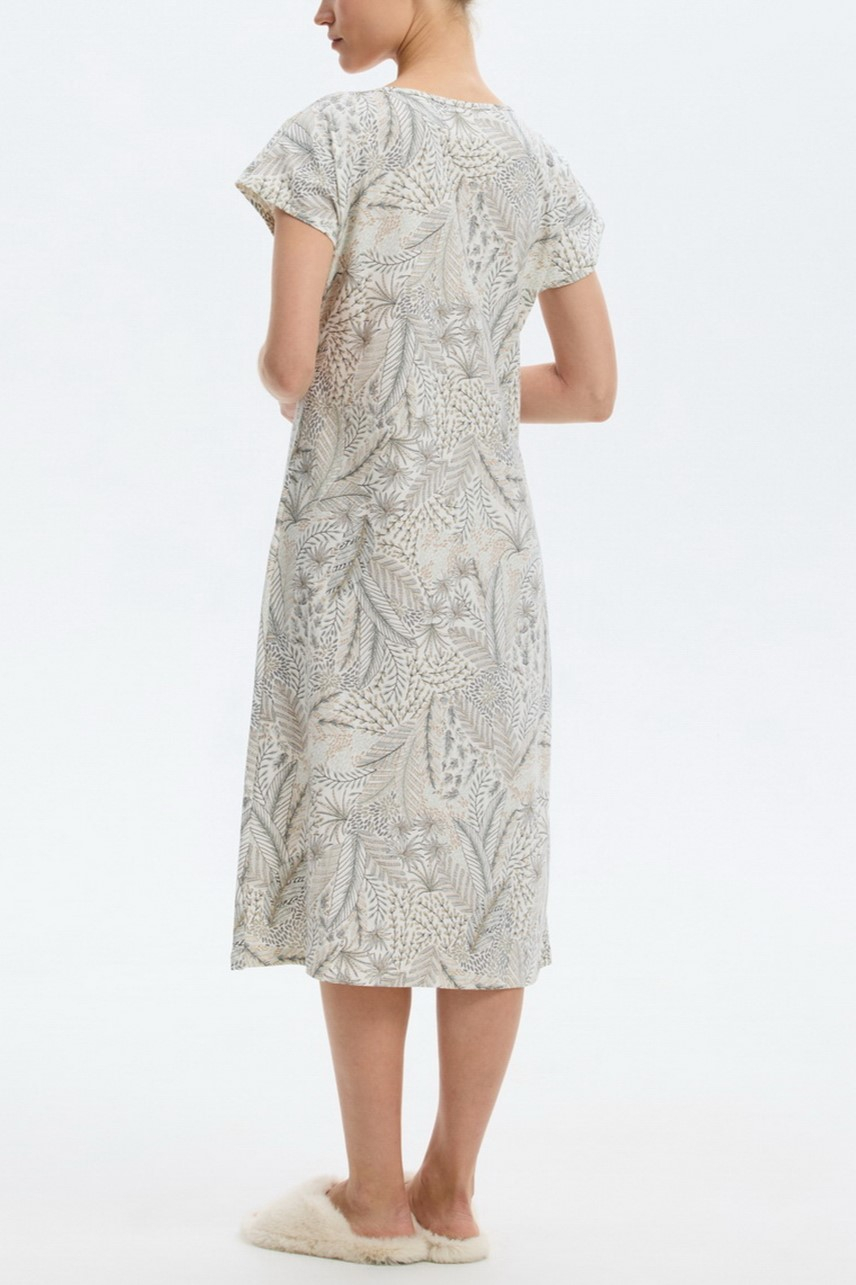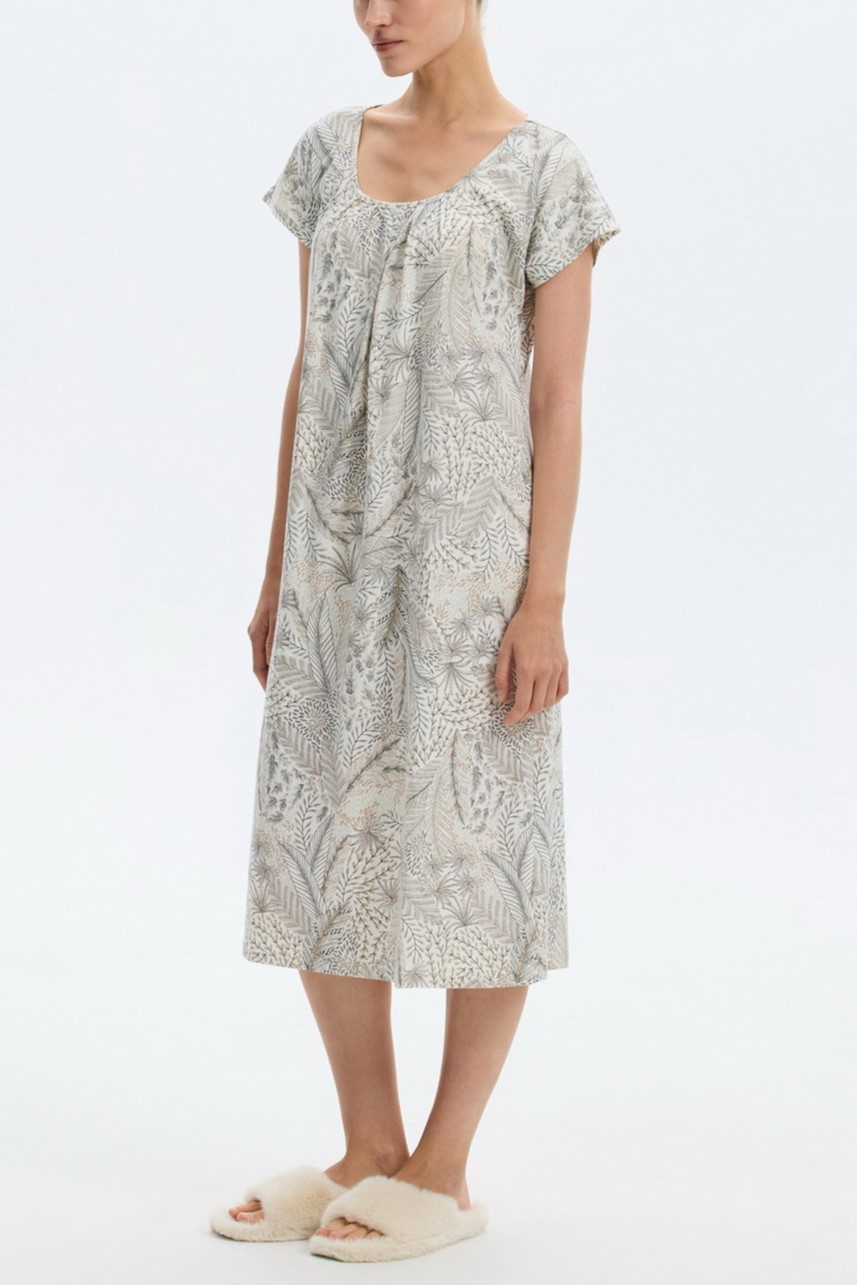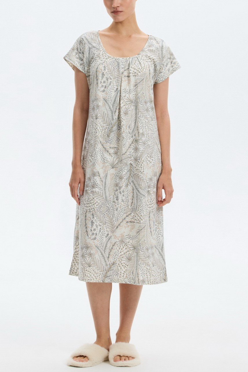 Нежная сорочка ниже колена с коротким рукавом и широким округлым вырезом.