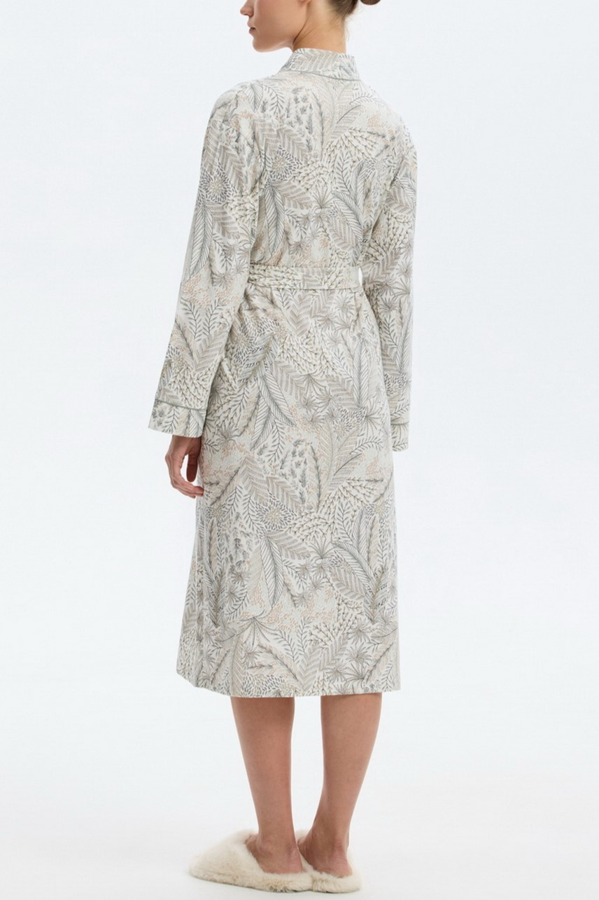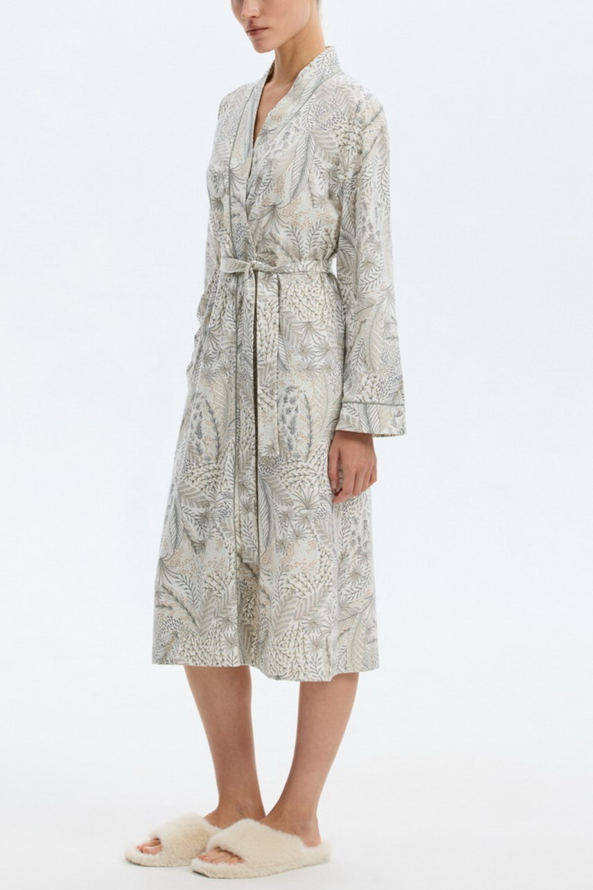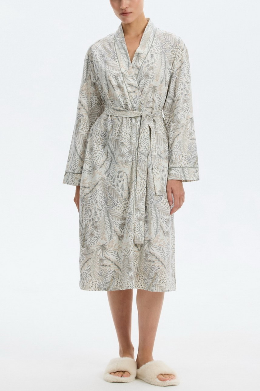 Нежный халат на запах длиной ниже колена в приятном растительном принте.