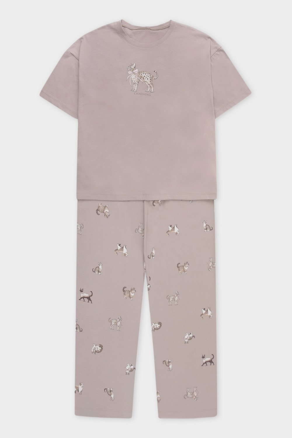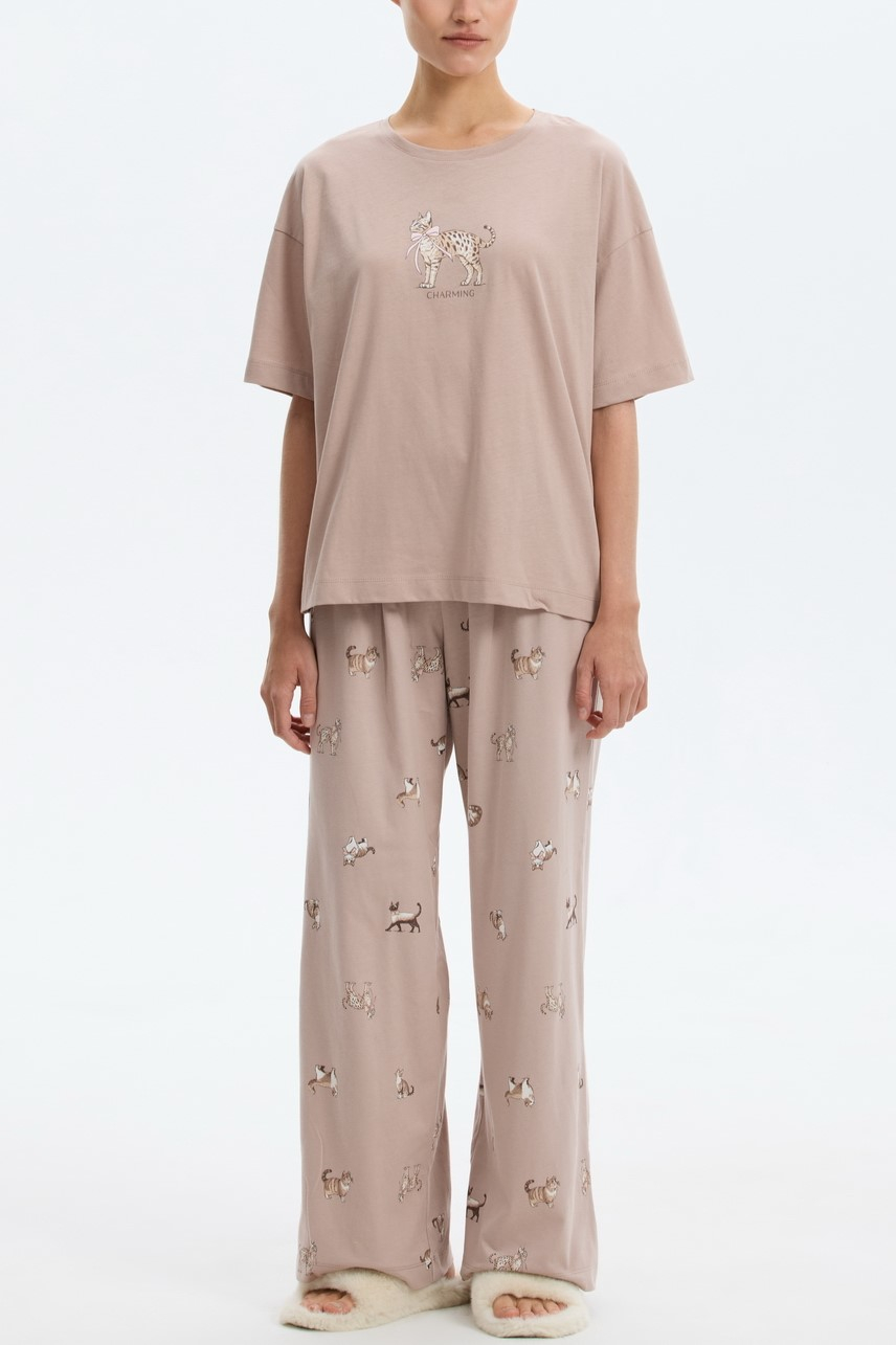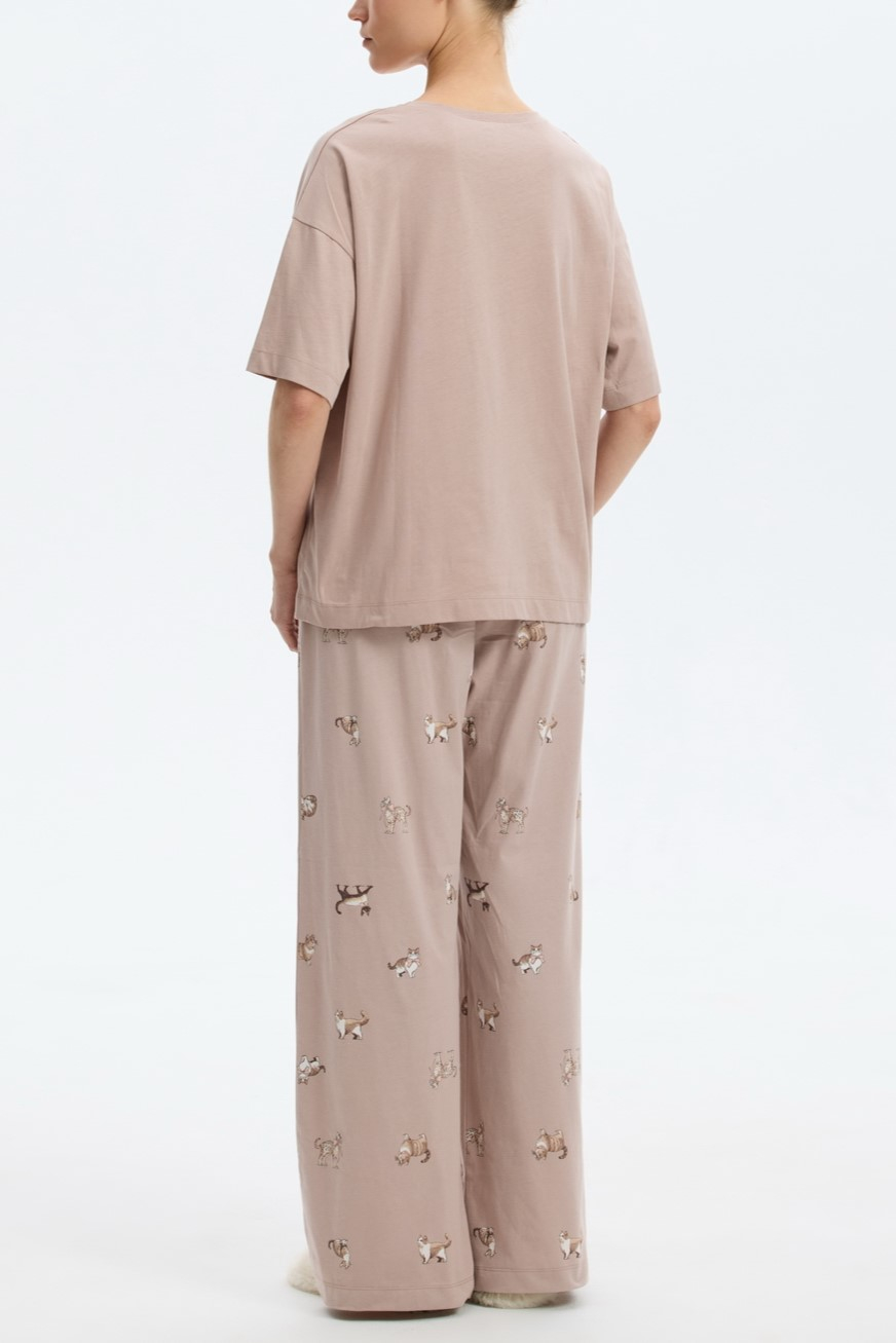Брюки свободного кроя с мягким эластичным поясом не сковывают движений. По бокам есть удобные карманы. Брюки украшает принт с милыми кошечками.