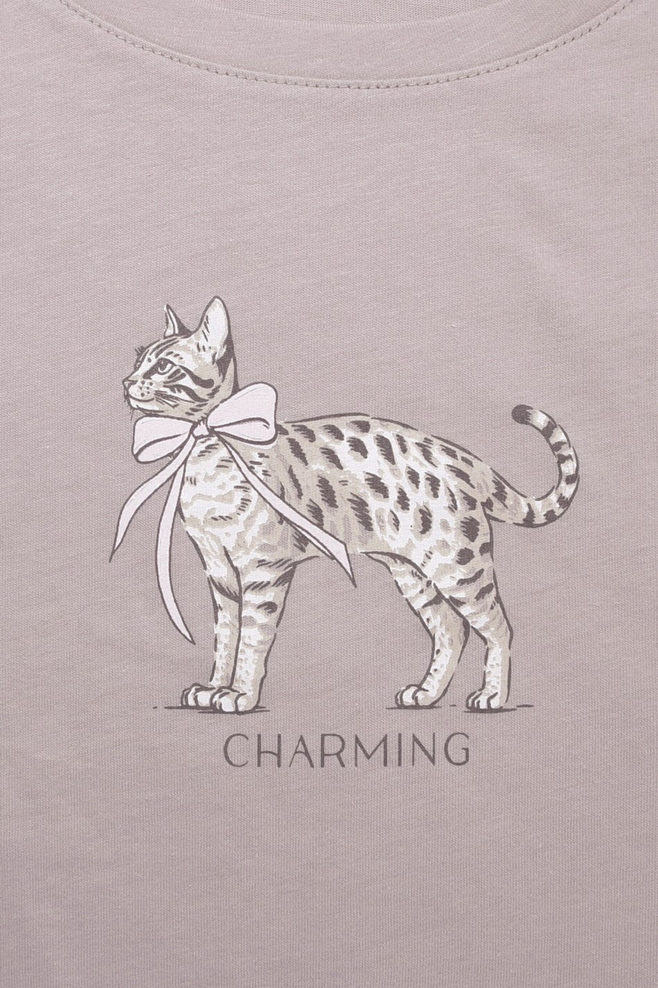 Футболка прямого силуэта с короткими рукавами и круглым вырезом по центру дополнена рисунком кота.