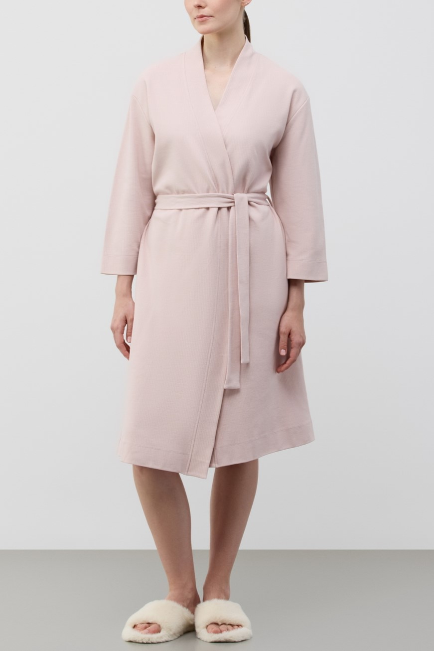 Модель на запах длиной до колена с длинными рукавами и V-образным вырезом. На талии подвязывается поясом, по бокам есть удобные карманы.