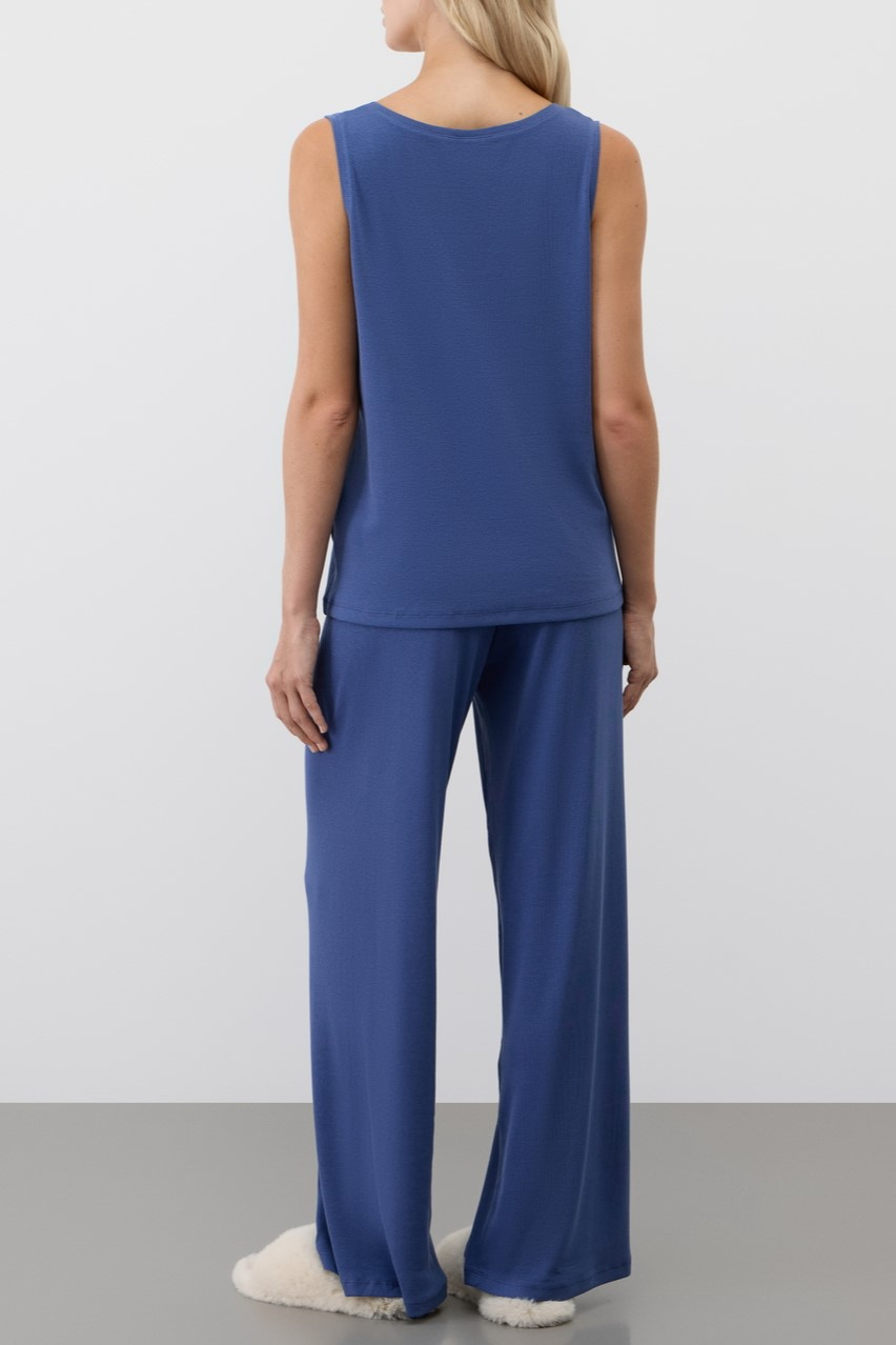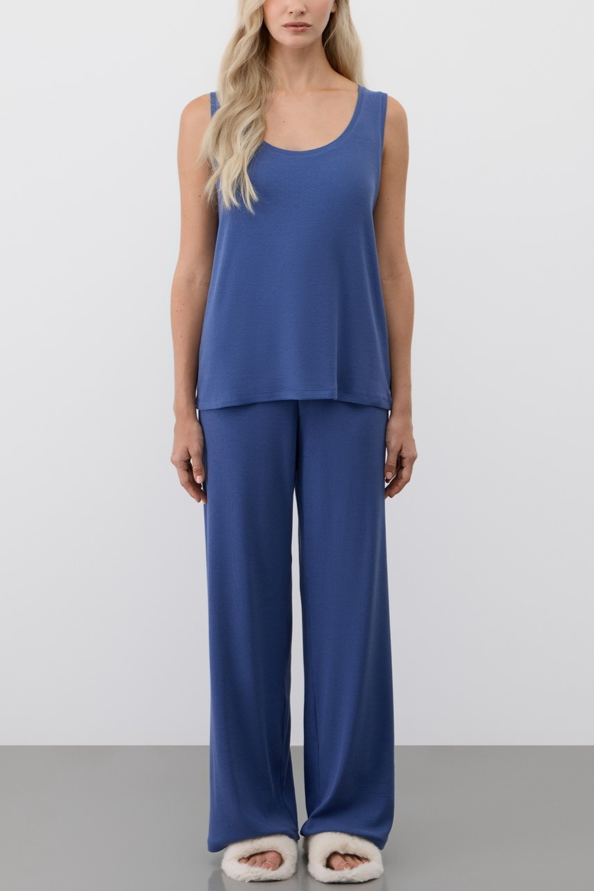 Комплект актуального кроя приятного синего цвета позволит выглядеть стильно даже в домашнем.