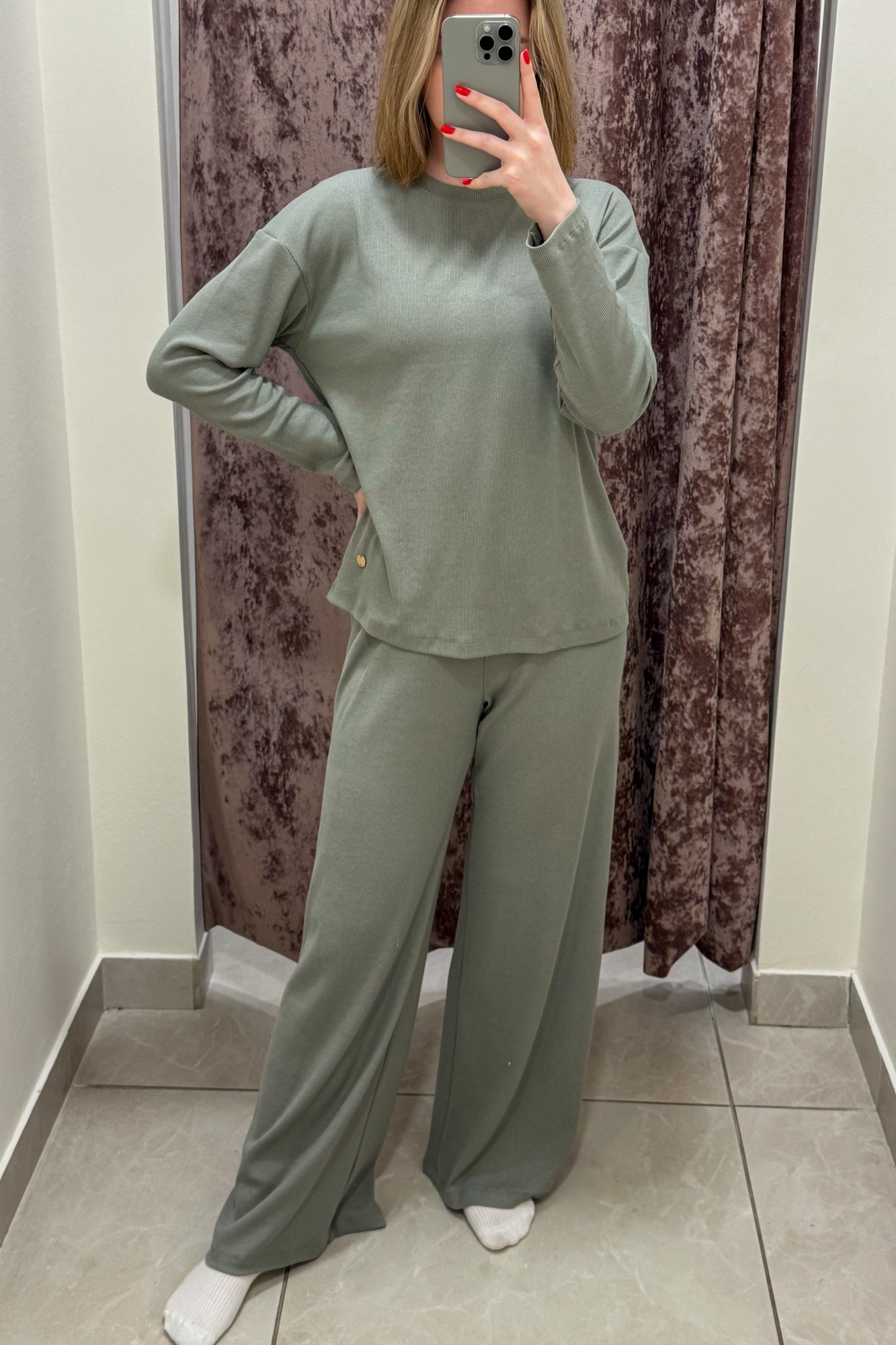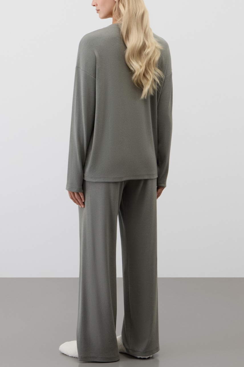 Лонгслив прямого кроя и свободные брюки без боковых швов создают актуальный уютный образ.