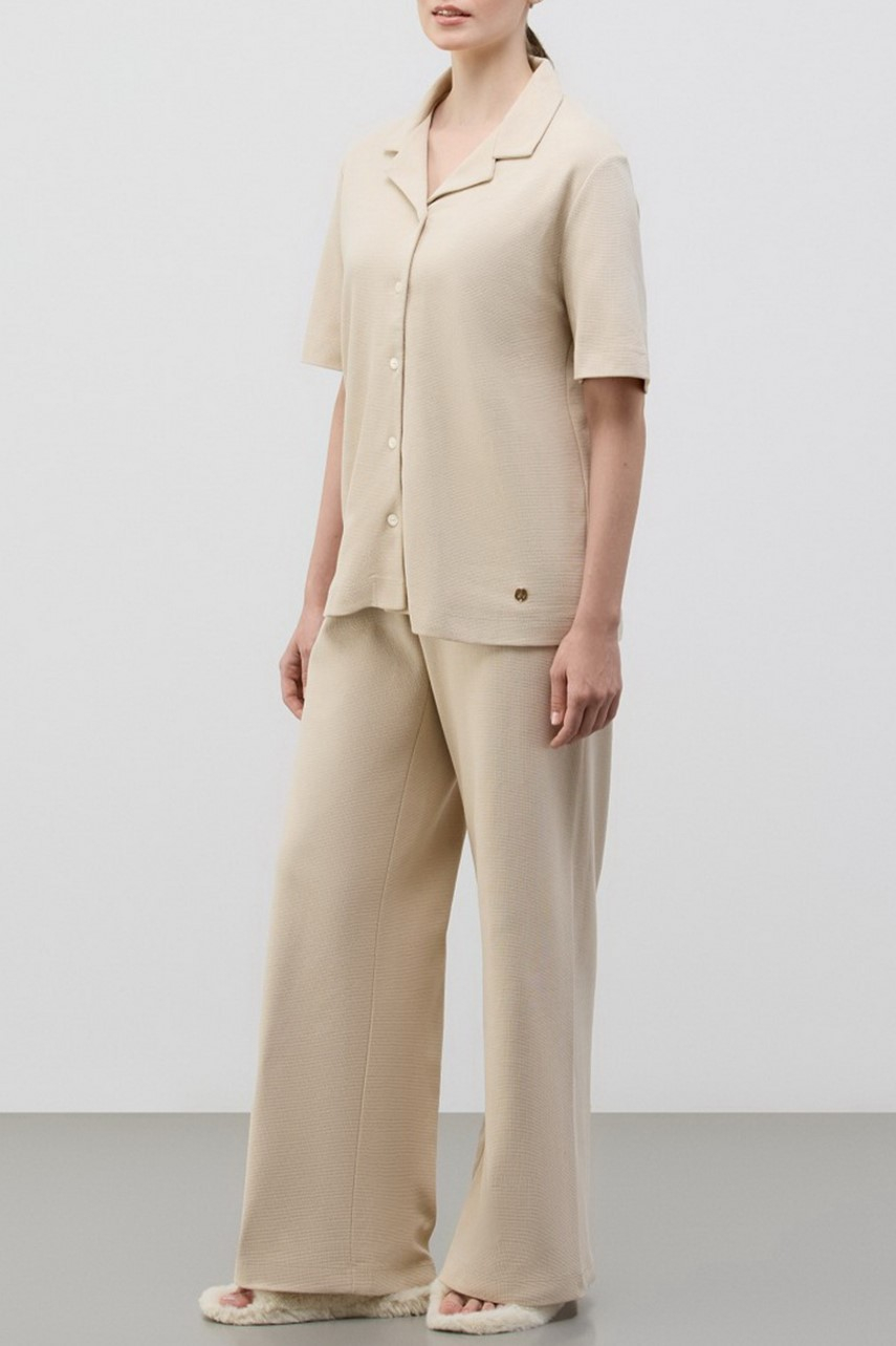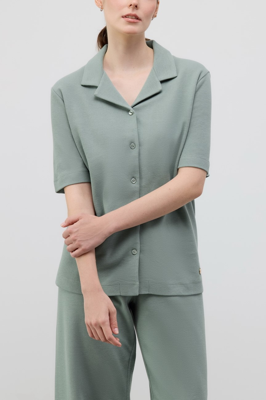 Рубашка на пуговицах с коротким рукавом и отложным воротником c V-образным вырезом.